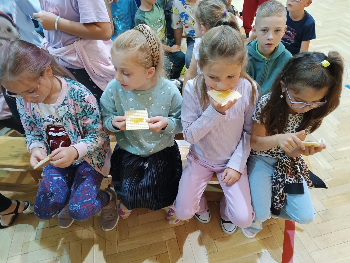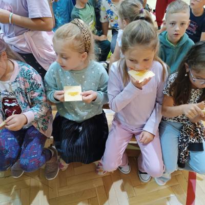 W dalszej części zajęć miały miejsce praktyczne akcenty. Dzieci miały okazję spróbować pyłku pszczelego oraz miodu, co stało się ciekawym doświadczeniem sensorycznym i pozwoliło im lepiej zrozumieć smakowe i zdrowotne wartości produktów pszczelich.