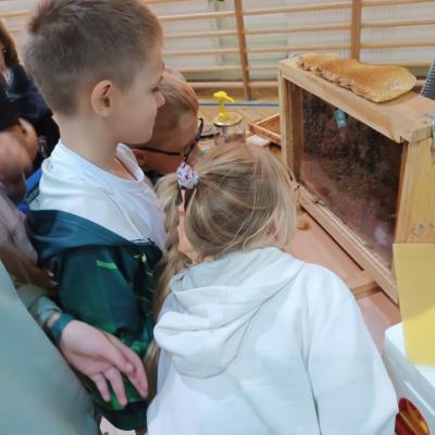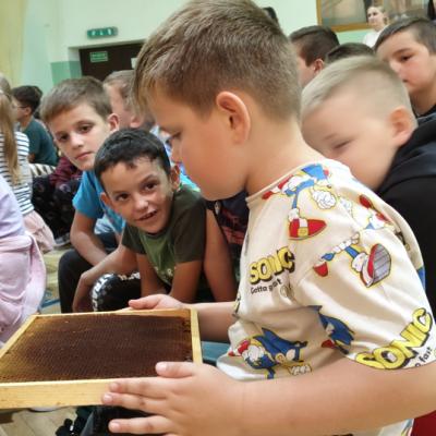 Podczas spotkania pani Karolina zaprezentowała rodzinę pszczół oraz pokazała „magiczny” ul, dzięki czemu dzieci mogły zobaczyć, jak wygląda miejsce pracy pszczelarza i jak funkcjonuje pasieka. Młodzi uczestnicy z zainteresowaniem obserwowali barwną aktywność pszczół oraz narzędzia używane do opieki nad pszczołami.
