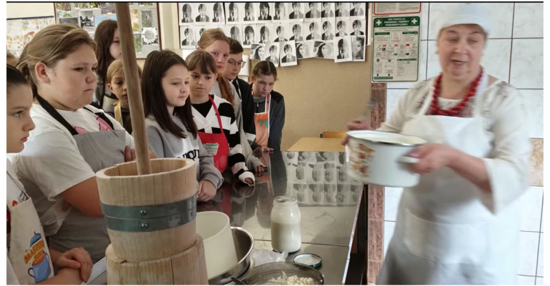 Tradycja znów zapachniała w powietrzu. Uczniowie naszej szkoły uczestniczyli w niezwykłych warsztatach kulinarnych prowadzonych przez panią Lucynę Jasińską i panią Danutę Kozimor z Koła Gospodyń Wiejskich w Nadolanach. Dzieci poznawały dawne metody wyrabiania masła i sera, ubijały śmietanę w maselnicy i obserwowały, jak z prostych składników powstaje złociste masło oraz domowy ser o naturalnym, aromatycznym smaku. Degustacja własnych wyrobów pokazała, że smak tradycji to coś więcej niż potrawa— to wspomnienie i więź z historią.