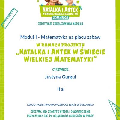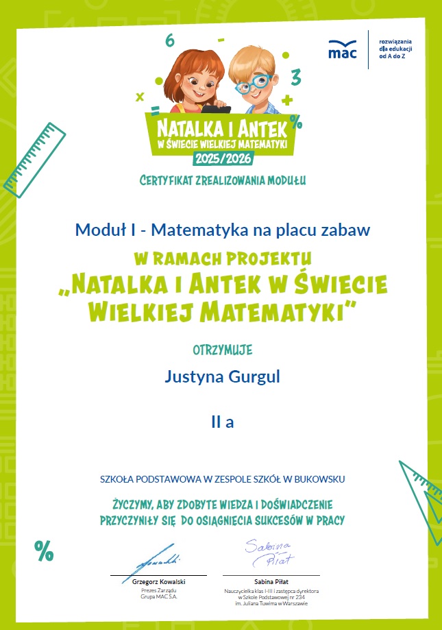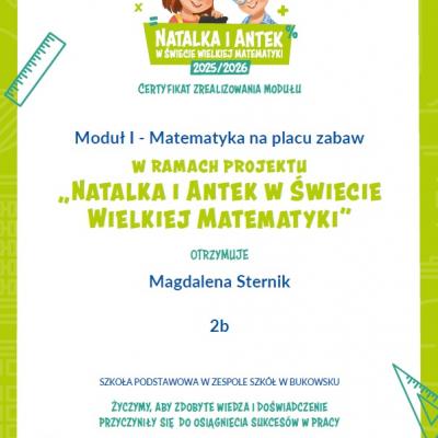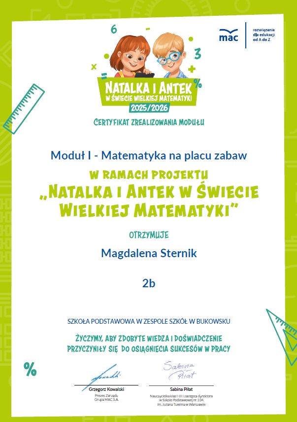 Uczniowie klas II a i II b biorą udział w ogólnopolskim projekcie edukacyjnym „Natalka i Antek w Świecie Wielkiej Matematyki”, którego celem jest rozwijanie kompetencji matematycznych, naukowych i społecznych, poprzez naukę połączoną z zabawą i odkrywaniem świata.