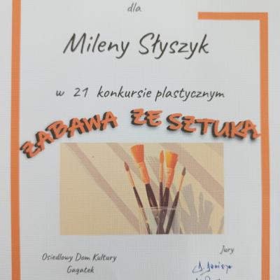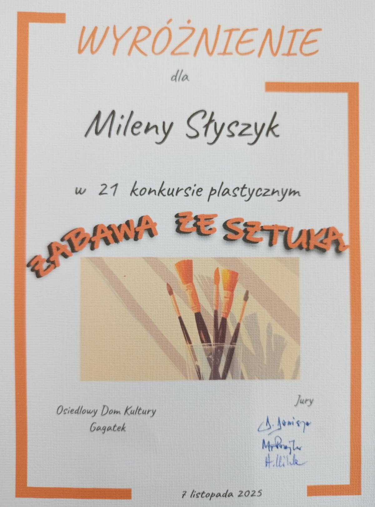 7 listopada br. odbył się finał 21 konkursu plastycznego: ”Zabawa ze sztuką” w ODK - Gagatek w Sanoku. Poziom tegorocznej edycji był bardzo wyrównany i wysoki. Ostatecznie wyróżniono 20 prac. Wśród laureatów znalazła się uczennica naszej szkoły – Milena Słyszyk z klasy VIIa.