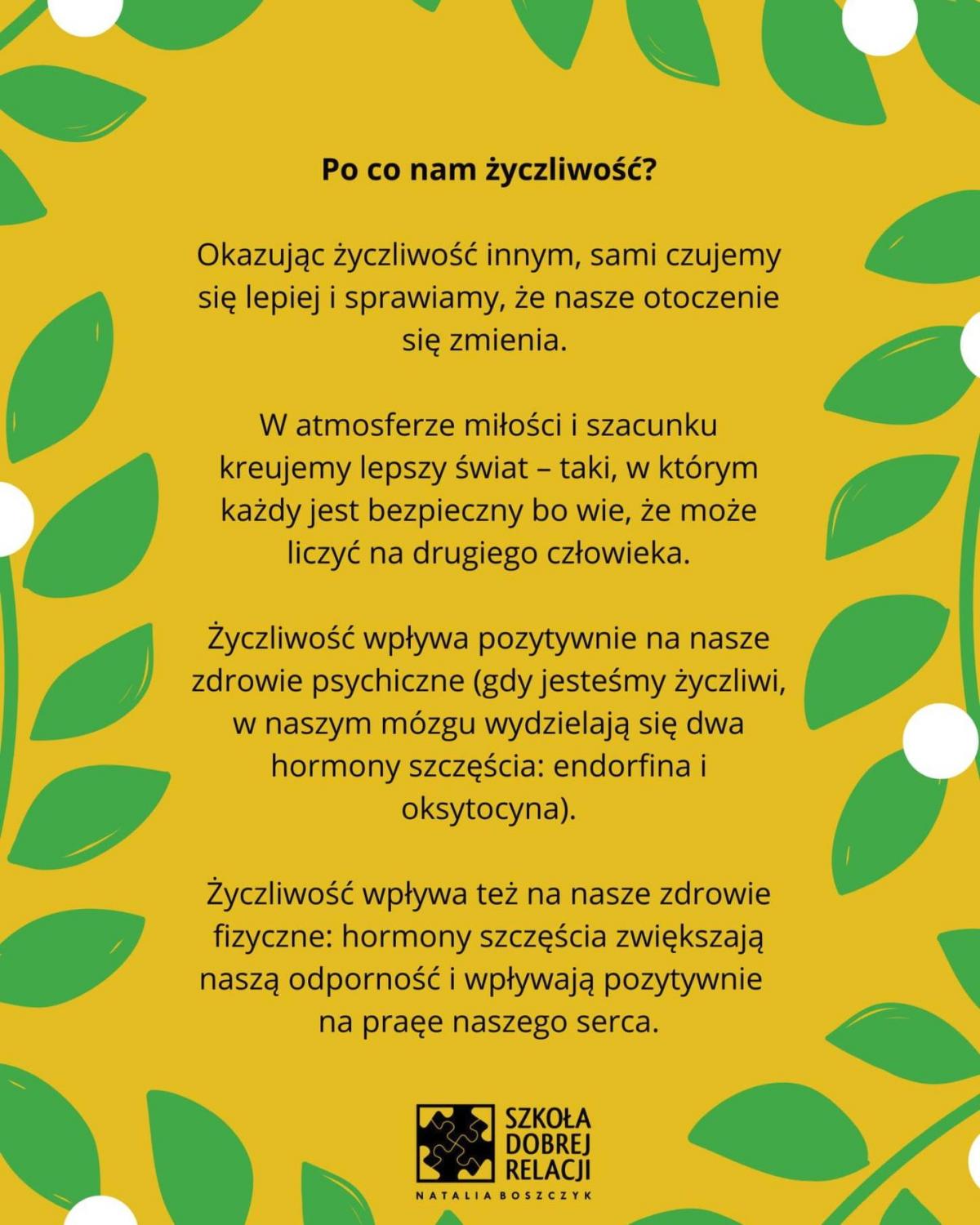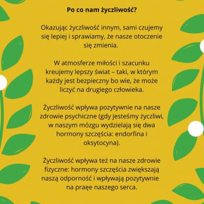21 listopada to dzień, kiedy nawet najmniejsze słowo czy uśmiech mogą sprawić, że świat staje się trochę piękniejszy. W obliczu tempa współczesnego życia, gdzie często gubimy się w codziennych zgiełkach, to wyjątkowa okazja, podczas której ludzie z różnych zakątków świata jednoczą się, aby celebrować wartość uprzejmości i miłych gestów w codziennym życiu. Pozdrowienia, podziękowania, życzenia stają się mostem, który łączy ludzi, przekraczając granice kultury, języka czy pochodzenia. Warto celebrować tę wyjątkową okazję, aby inspirować dobre uczynki i sprawić, że świat stanie się miejscem pełnym życzliwości i wzajemnego szacunku. To inicjatywa, która niezwykle integruje, dodaje skrzydeł, sieje dobro i jest dla Wszystkich, z tej możliwości skorzystali uczniowie. W szkole były pozytywniaczki, motywce, plakaty, kody QR, serduszka, kolorowanki, pojawiła się nawet Poczta Życzliwości, tylko miłe treści, słowa wdzięczność, uznania, wsparcia, pozdrowienia, życzenia na kartkach, w listach były przyjemnym akcentem świętowania. Chcieliśmy w ten sposób zatrzymać się na chwilę i pokazać, jak wielką moc mają dobre słowa, pomocne dłonie i małe gesty. To była świetna okazja, by wprowadzić aktywności, które poprawią humor, promują dobre relacji, uczą empatii, współpracy i uważnego bycia ze sobą nawzajem.