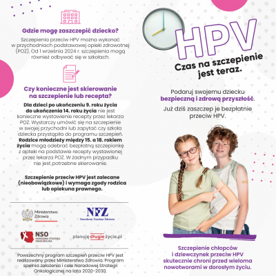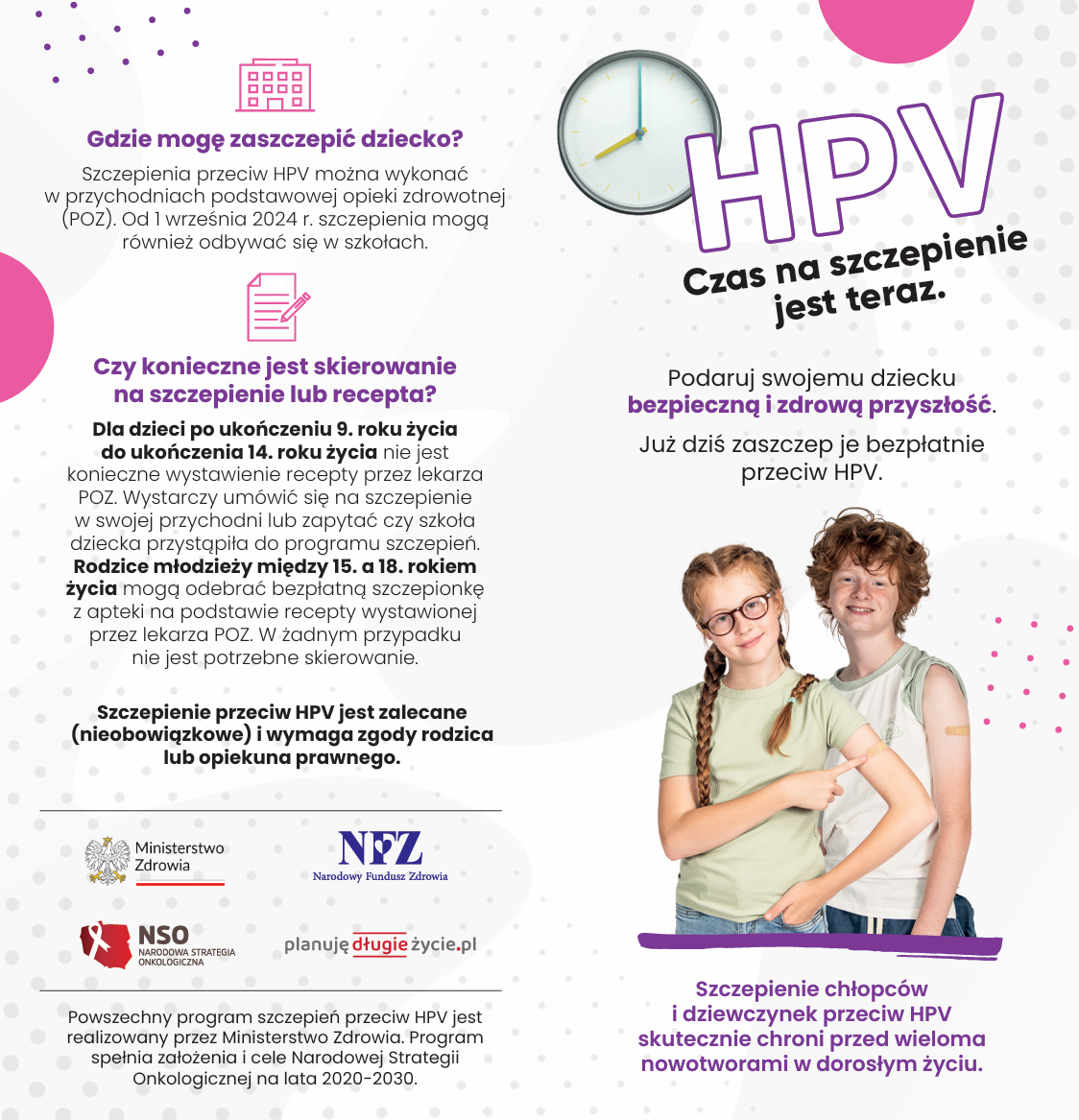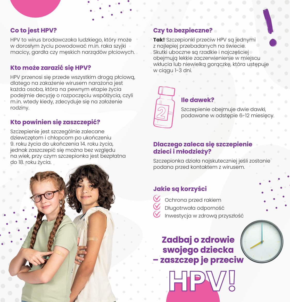 Od 1 września 2024 r. uczniowie w wieku od 9 do 14 lat mogą skorzystać z bezpłatnych szczepień przeciw wirusowi HPV w ramach powszechnego programu szczepień. Program realizuje Narodową Strategię Onkologiczną na lata 2020–2030 i uzupełnia kalendarz szczepień ochronnych dla dzieci i młodzieży.