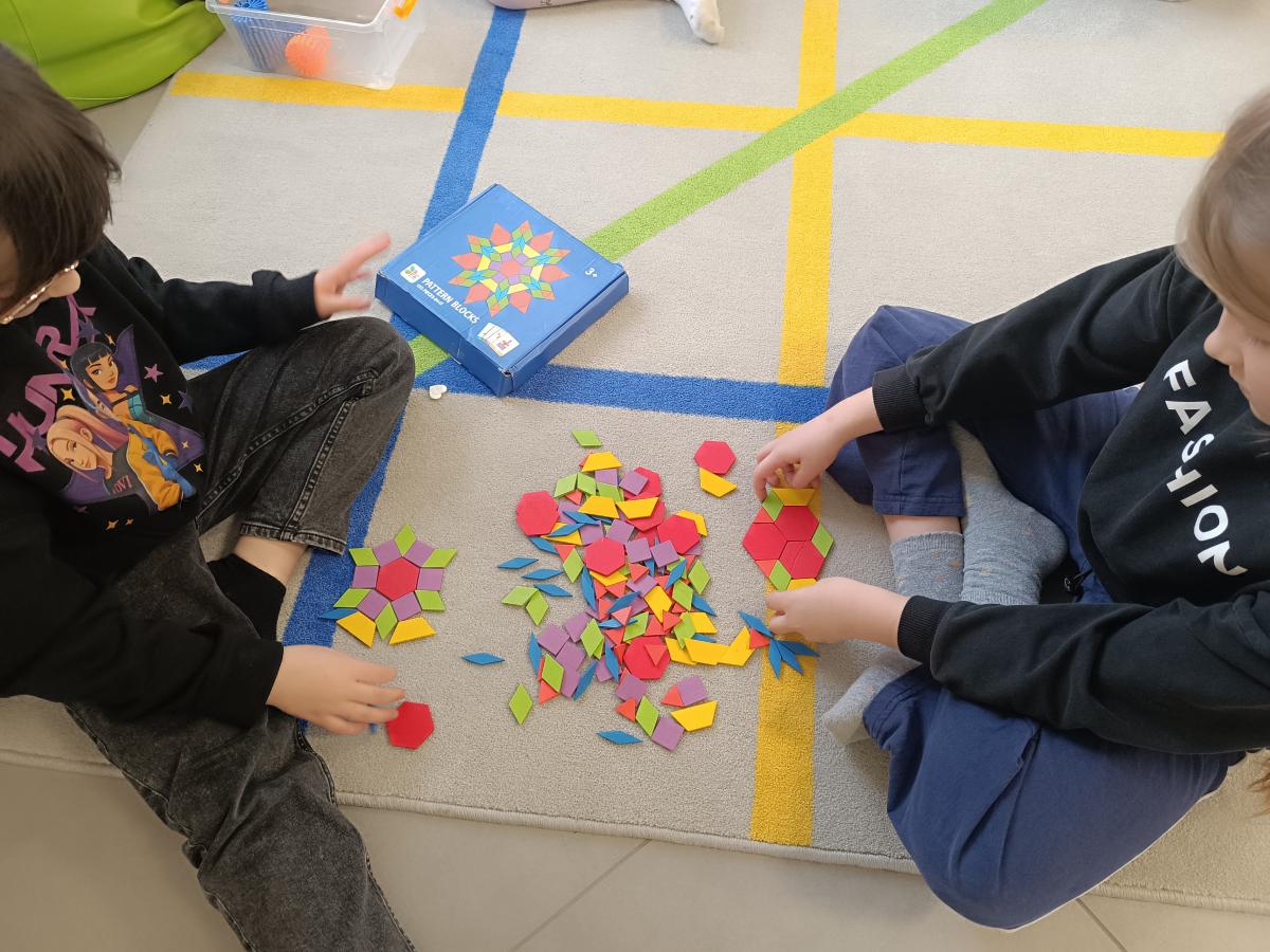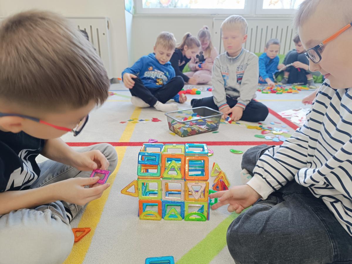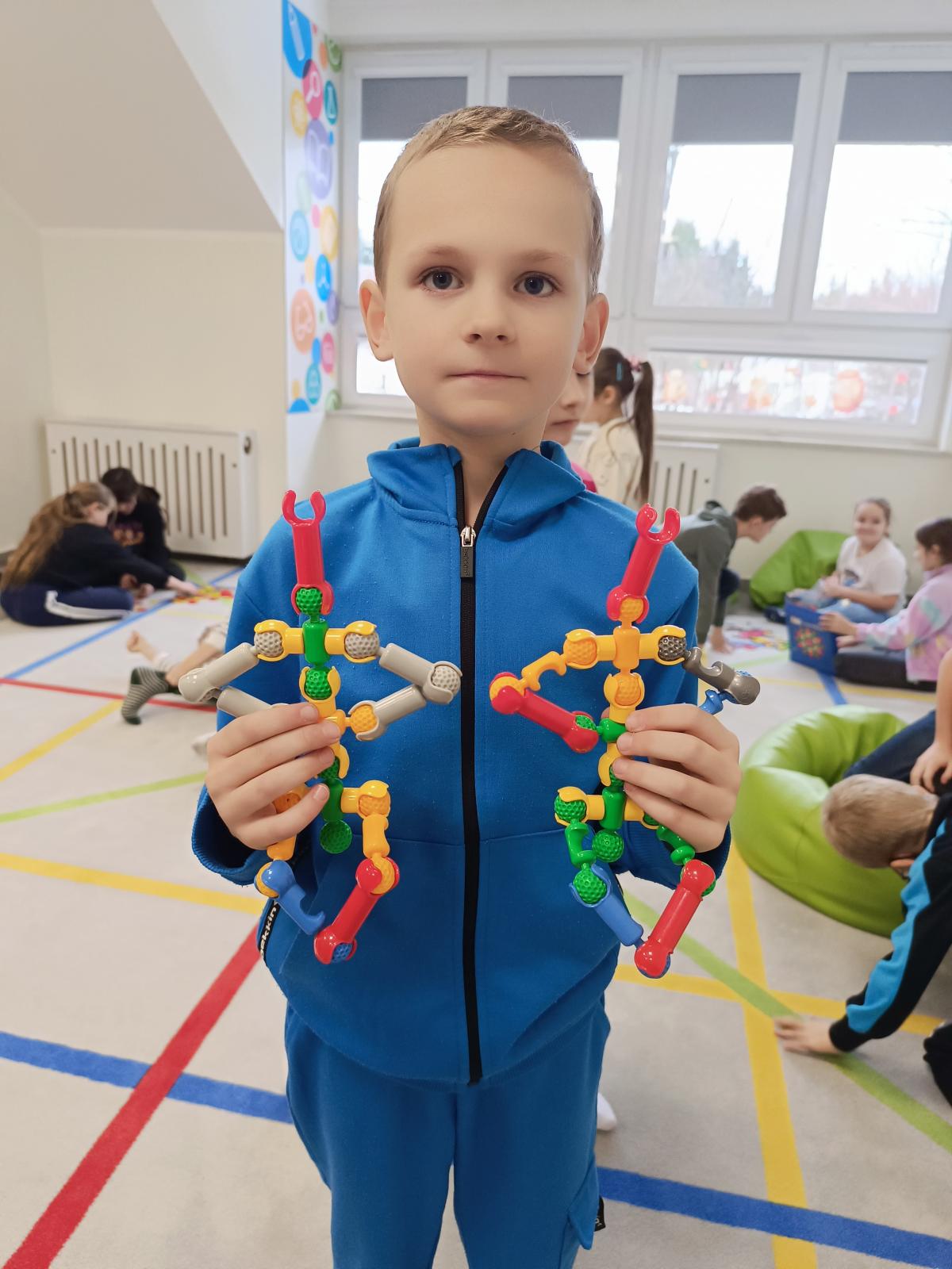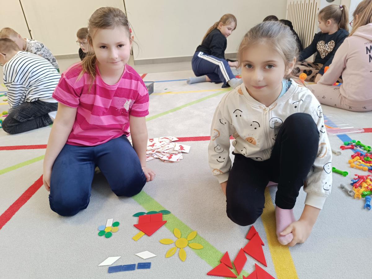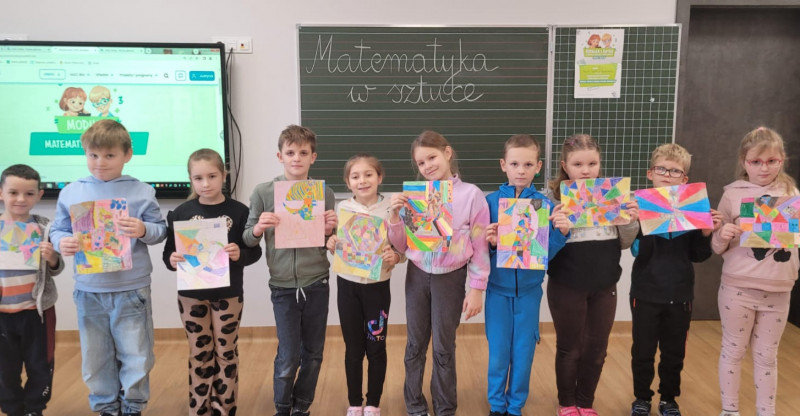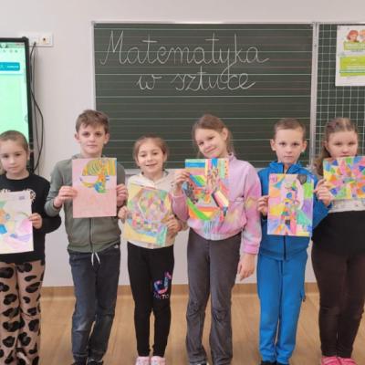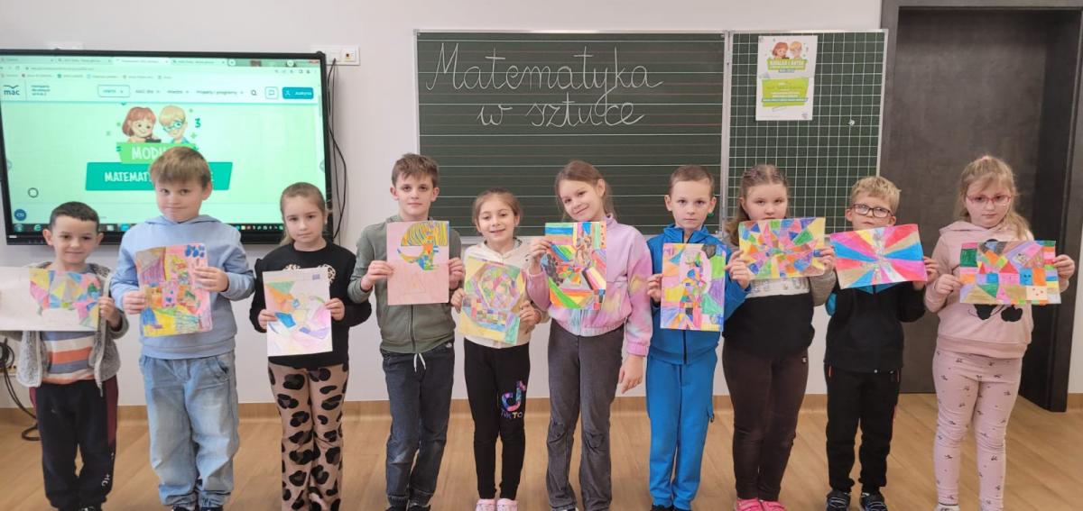 Na zajęciach projektu „Natalka i Antek w Świecie Wielkiej Matematyki” uczniowie poznawali temat „Matematyka w sztuce”. Na początku obejrzeli film ukazujący, że matematyka jest ściśle związana ze światem artystycznym – wpływa na kompozycję, proporcje i kształty. Następnie rozwiązywali zadania matematyczne związane z geometrią i symetrią. W części praktycznej dzieci tworzyły własne prace plastyczne, wykorzystując różnorodne kształty, a także budowały z klocków różne figury, rzeźby i bryły. Zajęcia pokazały, że matematyka może być twórcza, ciekawa i inspirująca.