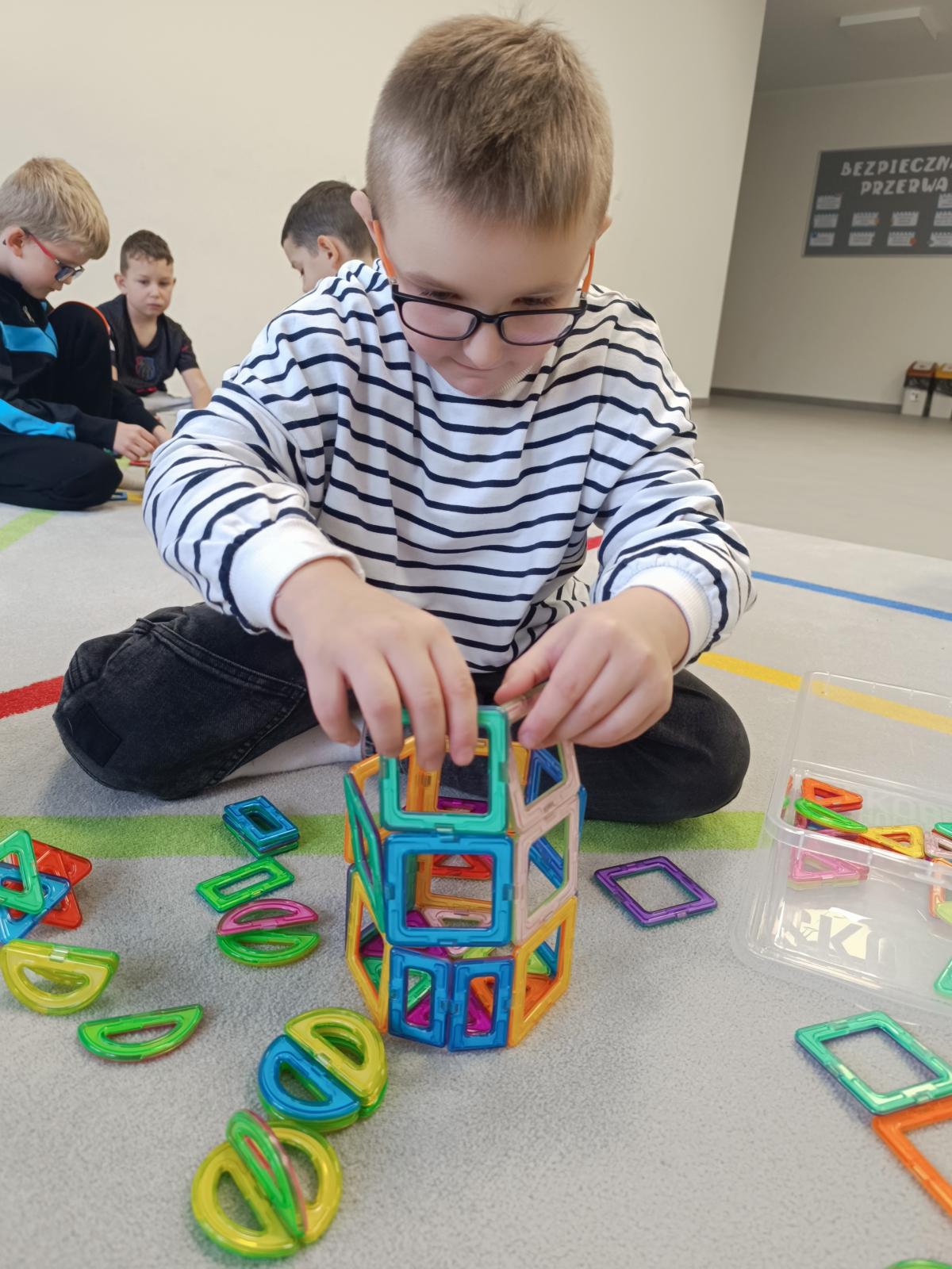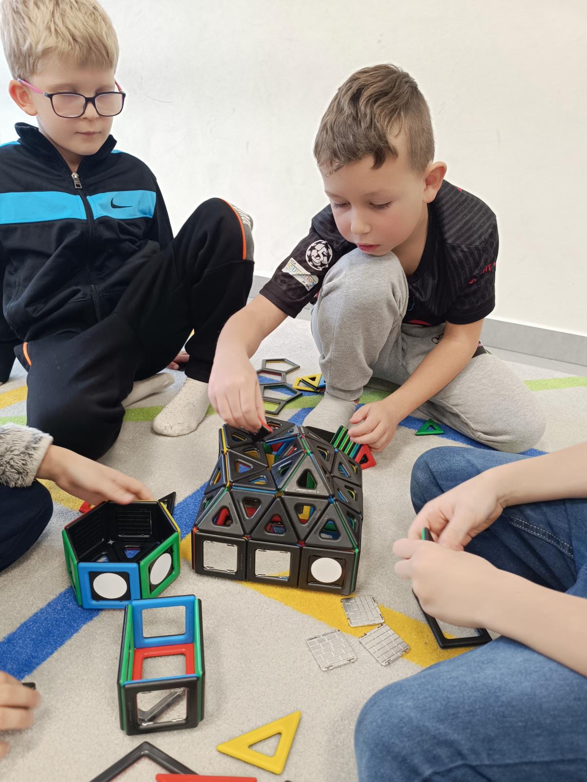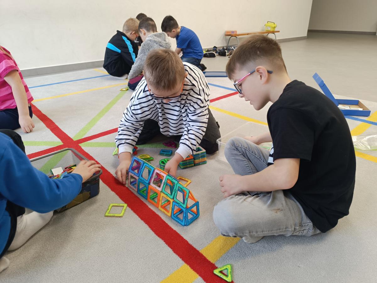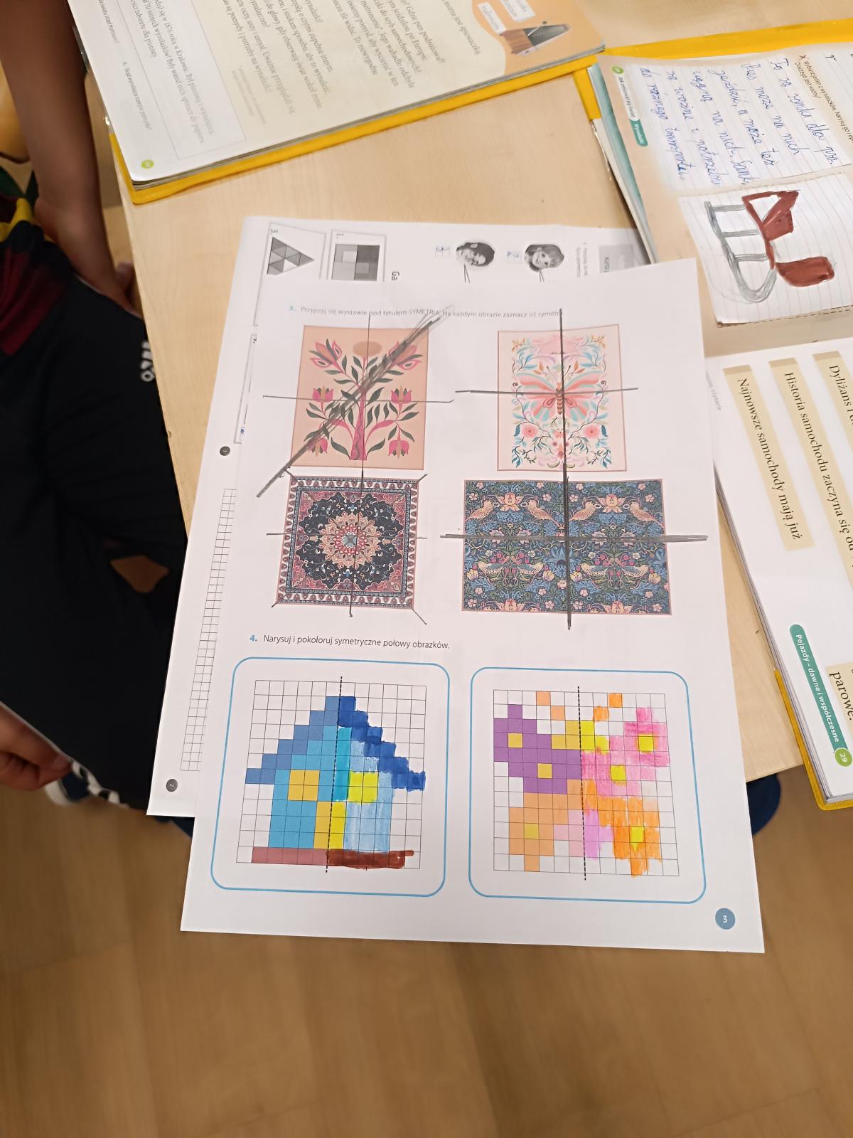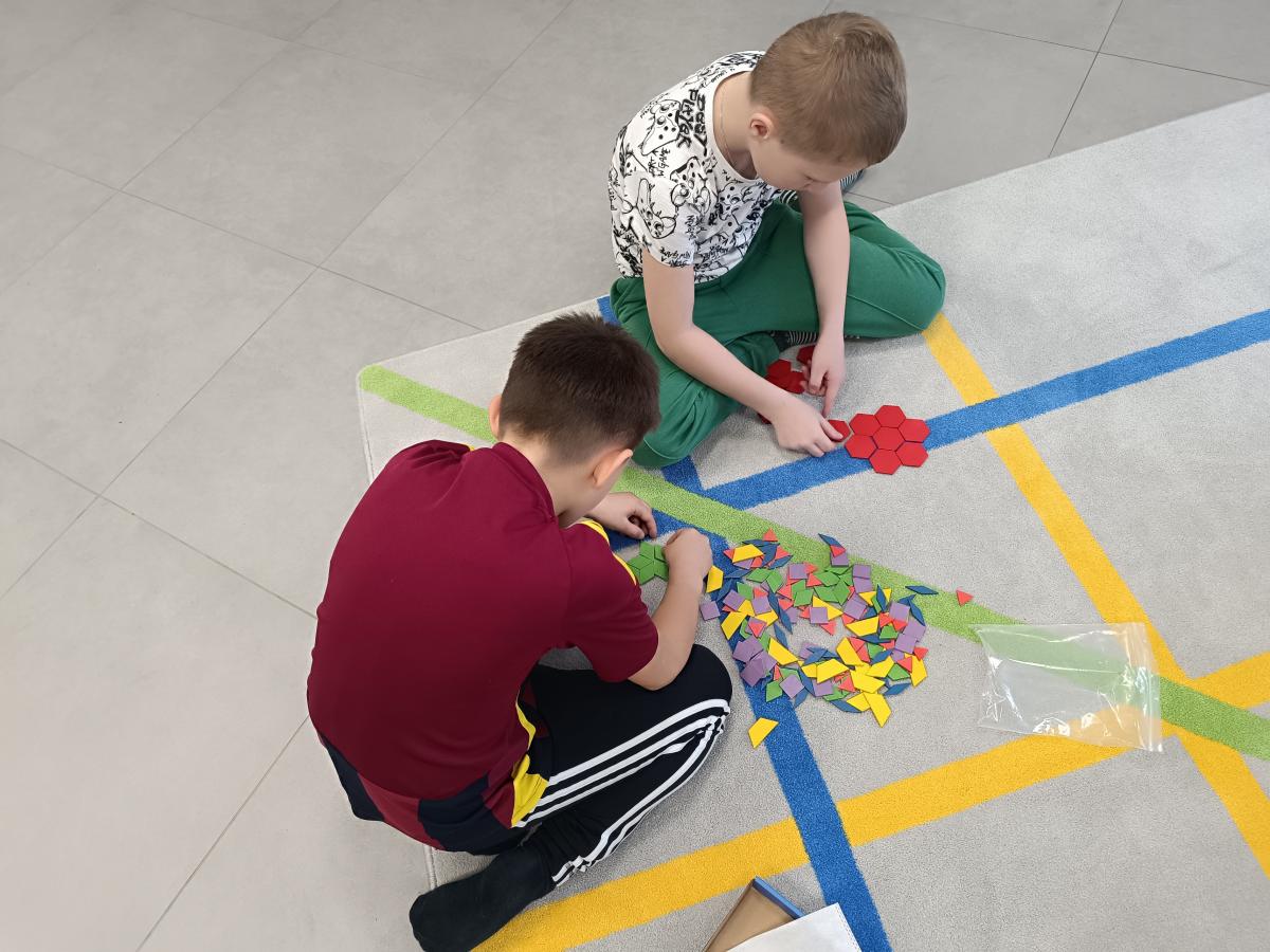 Na zajęciach projektu „Natalka i Antek w Świecie Wielkiej Matematyki” uczniowie poznawali temat „Matematyka w sztuce”. Na początku obejrzeli film ukazujący, że matematyka jest ściśle związana ze światem artystycznym – wpływa na kompozycję, proporcje i kształty. Następnie rozwiązywali zadania matematyczne związane z geometrią i symetrią. W części praktycznej dzieci tworzyły własne prace plastyczne, wykorzystując różnorodne kształty, a także budowały z klocków różne figury, rzeźby i bryły. Zajęcia pokazały, że matematyka może być twórcza, ciekawa i inspirująca.