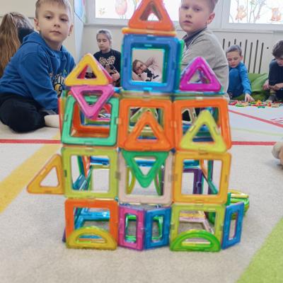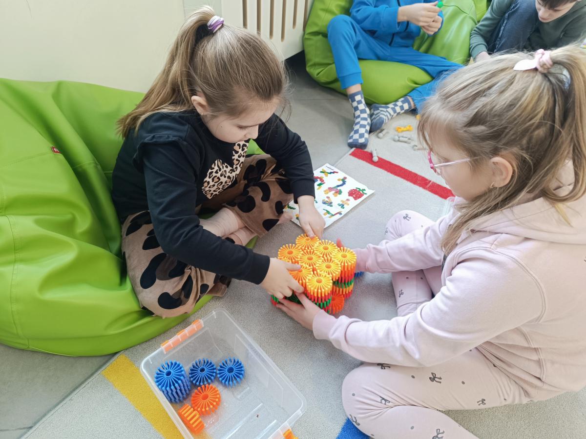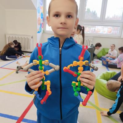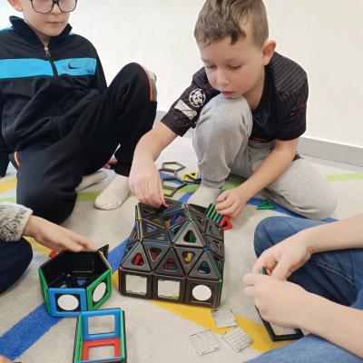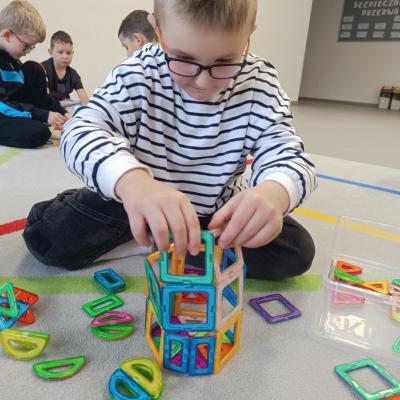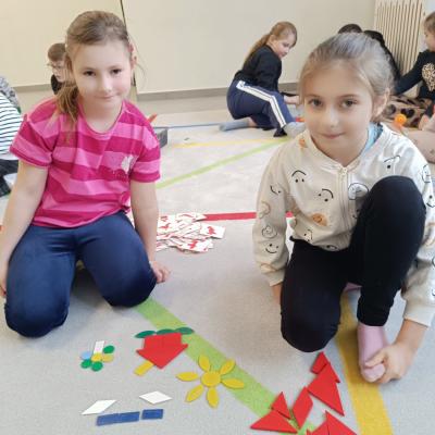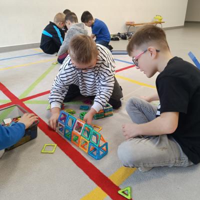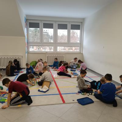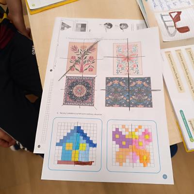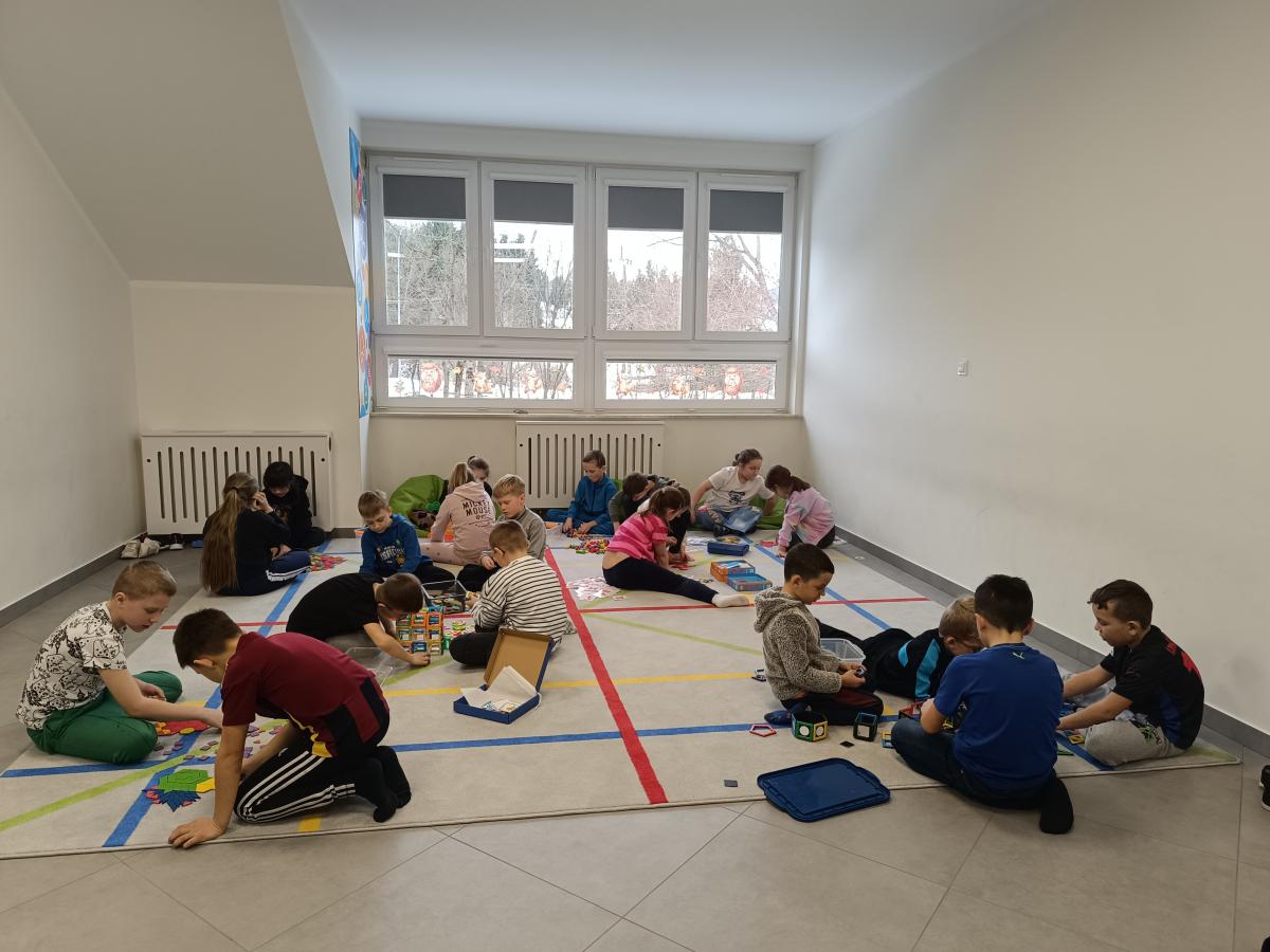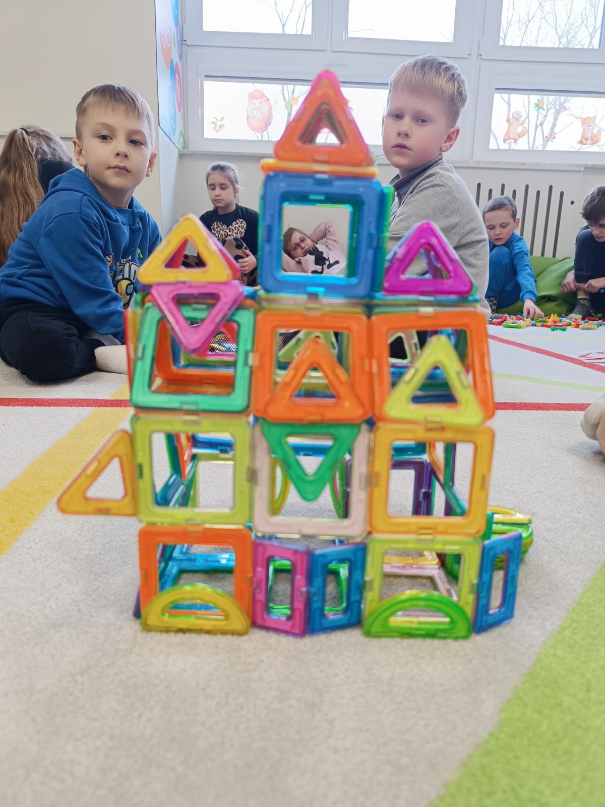 Na zajęciach projektu „Natalka i Antek w Świecie Wielkiej Matematyki” uczniowie poznawali temat „Matematyka w sztuce”. Na początku obejrzeli film ukazujący, że matematyka jest ściśle związana ze światem artystycznym – wpływa na kompozycję, proporcje i kształty. Następnie rozwiązywali zadania matematyczne związane z geometrią i symetrią. W części praktycznej dzieci tworzyły własne prace plastyczne, wykorzystując różnorodne kształty, a także budowały z klocków różne figury, rzeźby i bryły. Zajęcia pokazały, że matematyka może być twórcza, ciekawa i inspirująca.