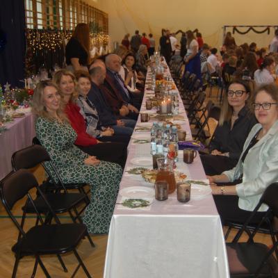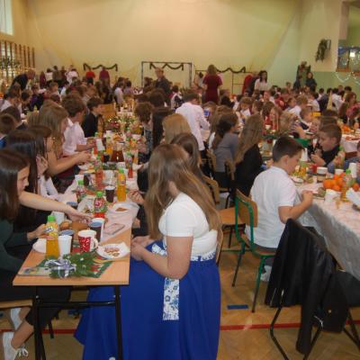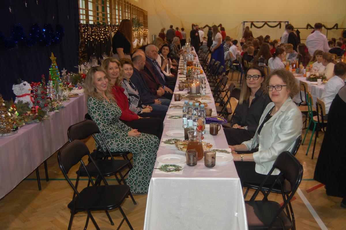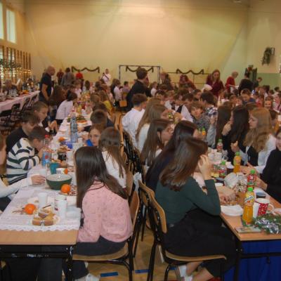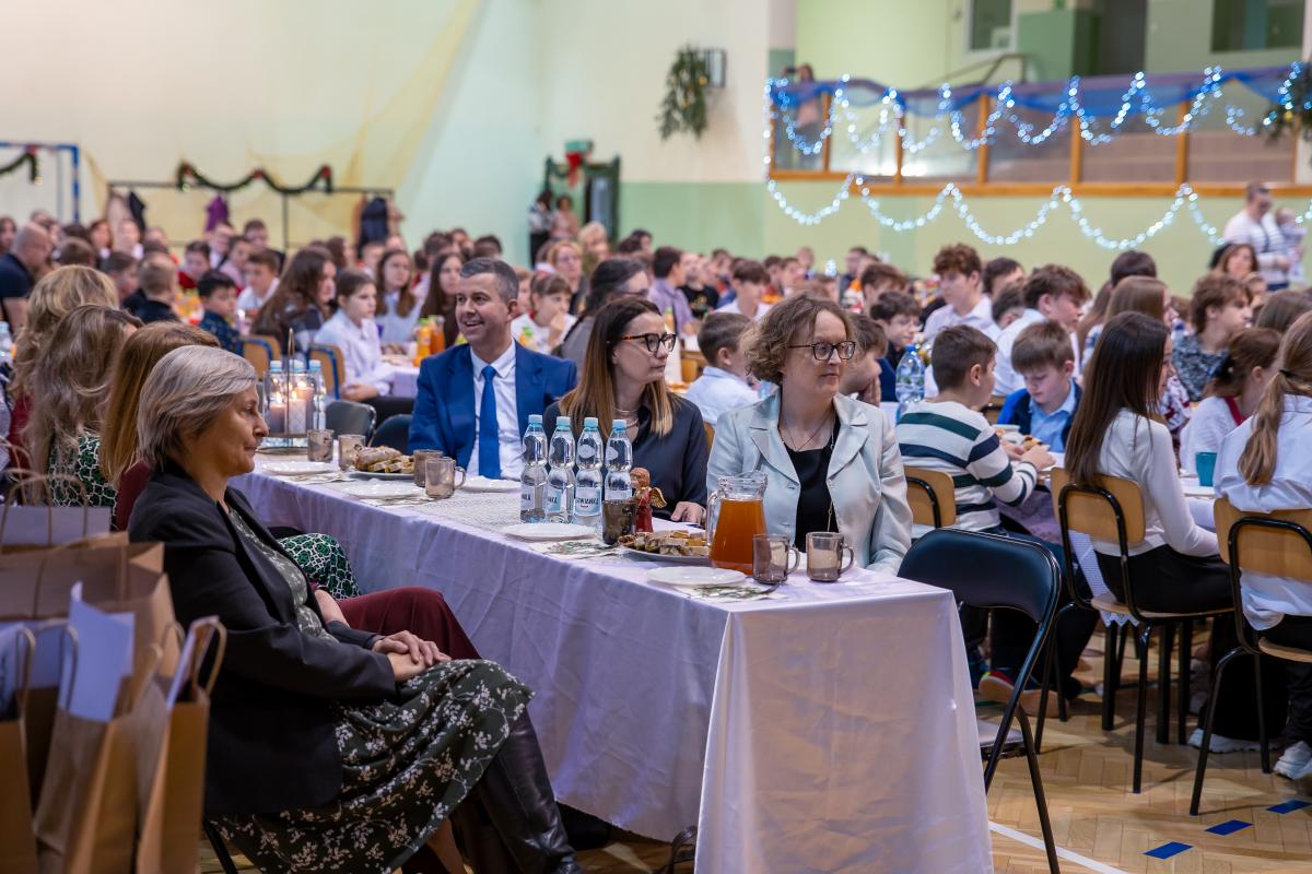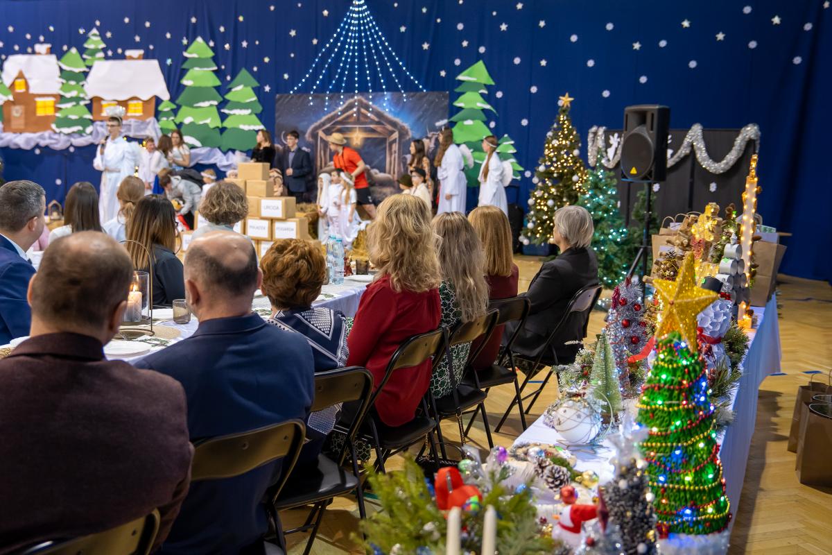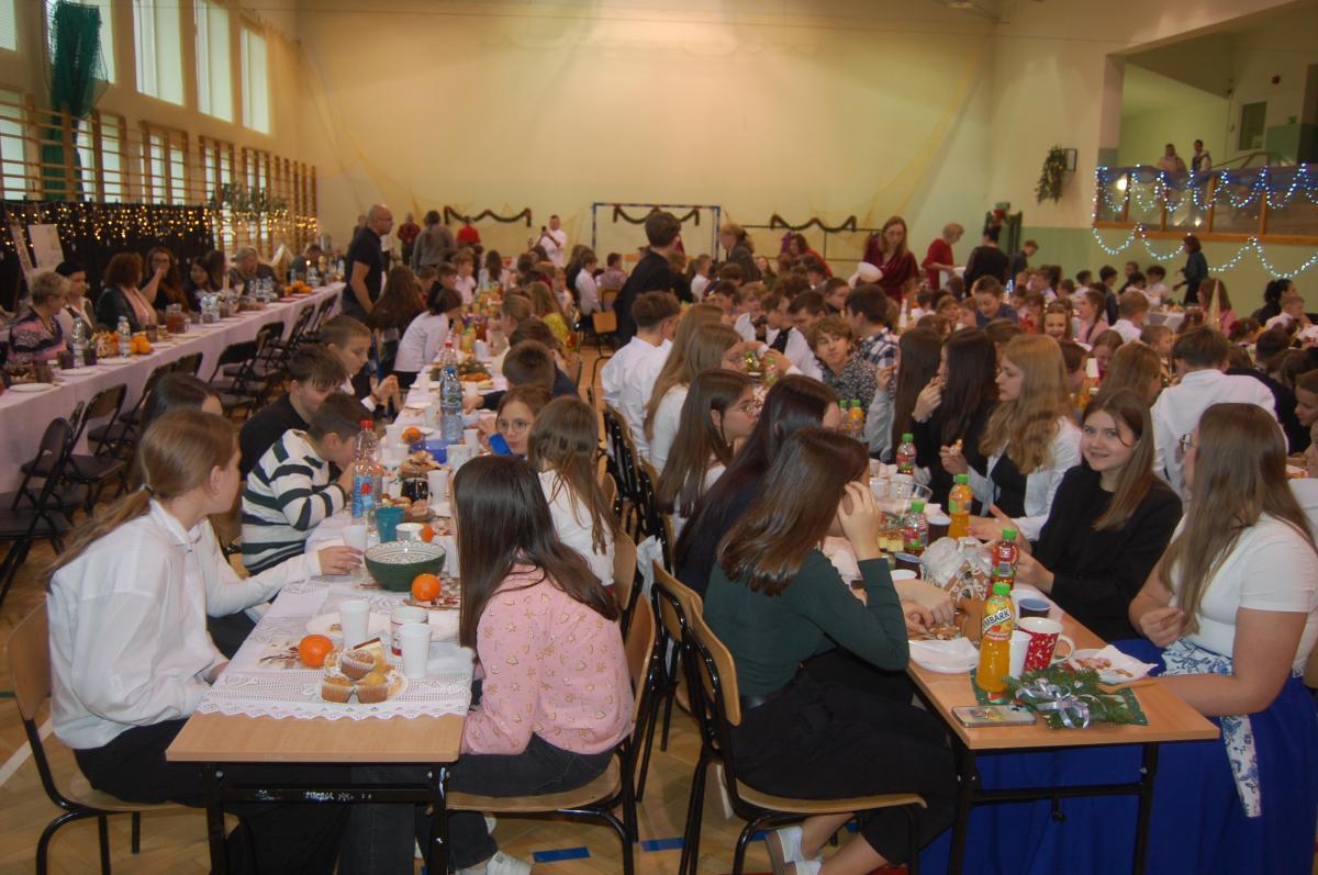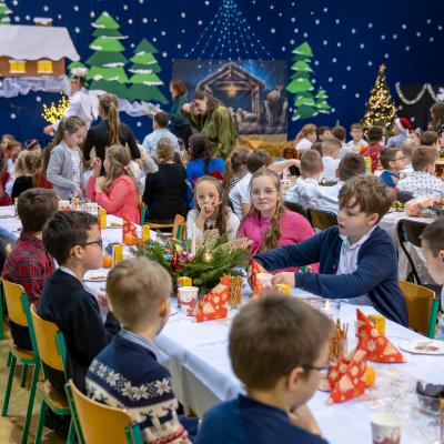 Po zakończonych występach wszyscy zebrani mieli okazję wspólnie spędzić czas przy wigilijnym stole. Nie zabrakło tradycyjnych potraw przygotowanych przez uczestników warsztatów kulinarnych – naszych uczniów – oraz różnorodnych słodkości, które dodatkowo umiliły to świąteczne spotkanie.