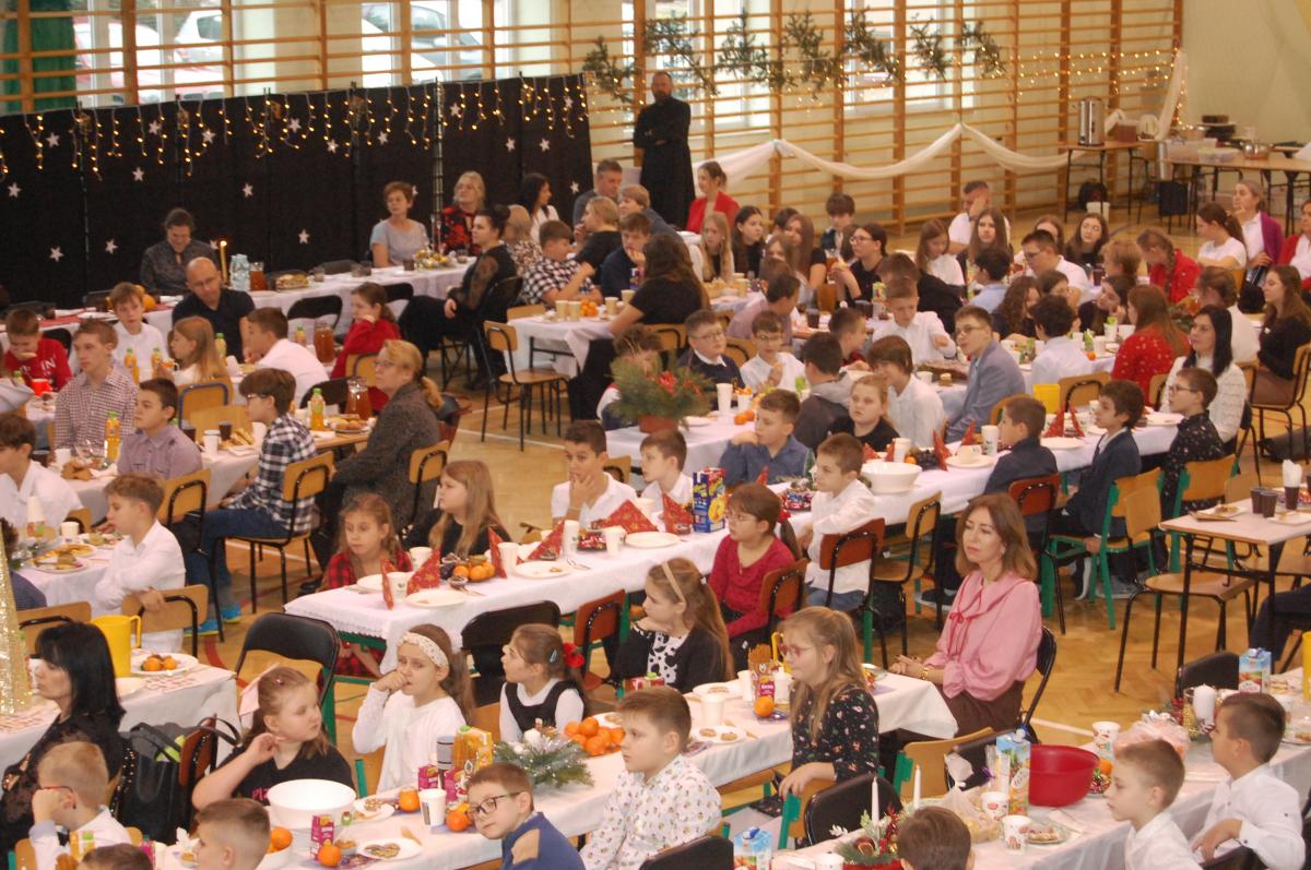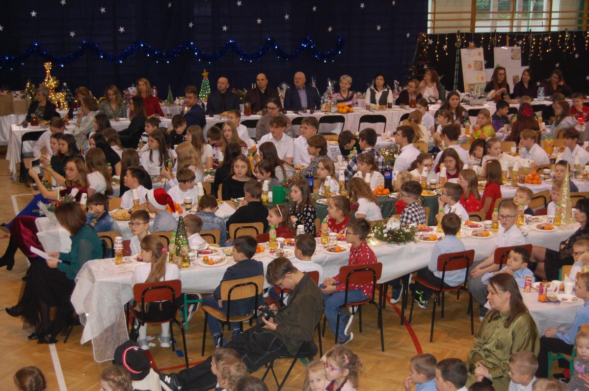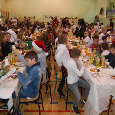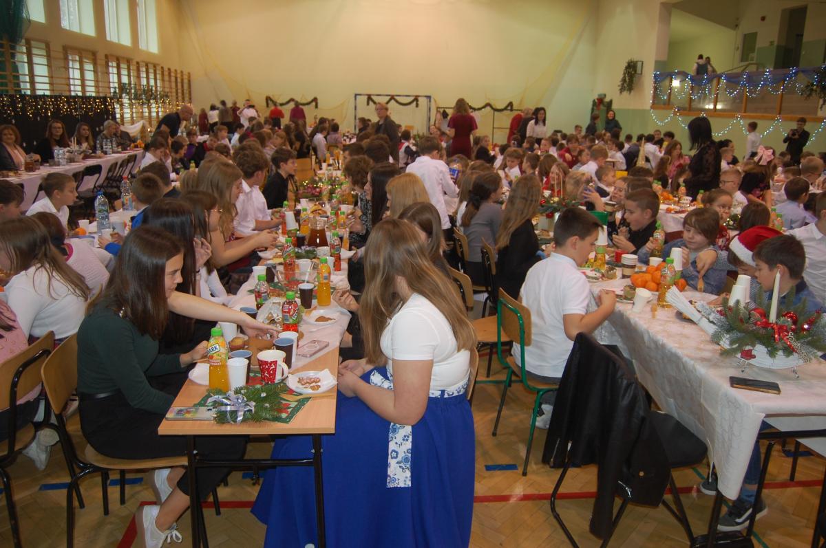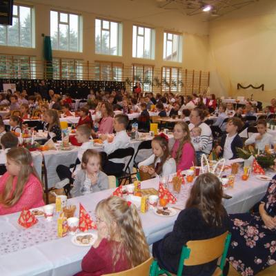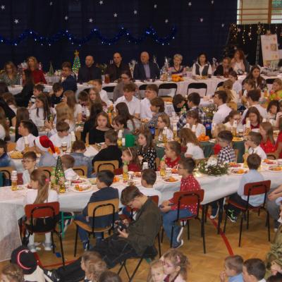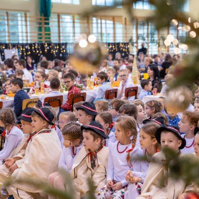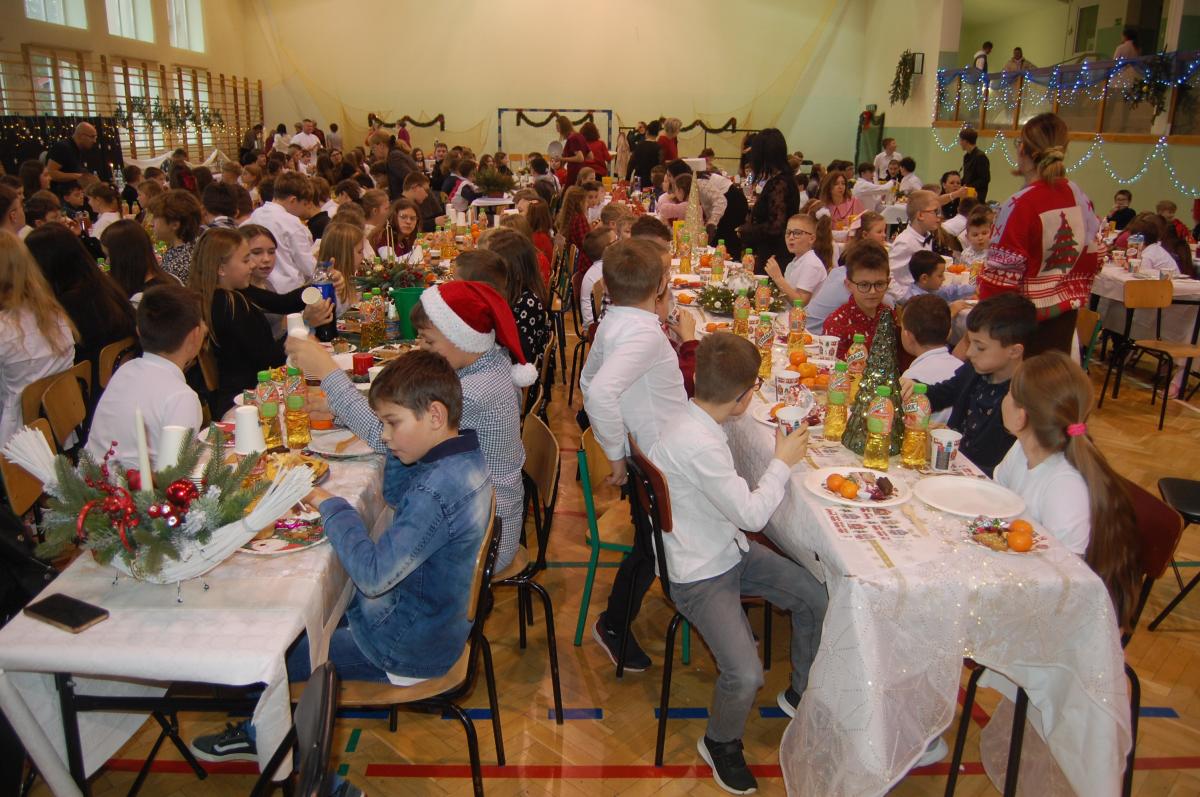 Po zakończonych występach wszyscy zebrani mieli okazję wspólnie spędzić czas przy wigilijnym stole. Nie zabrakło tradycyjnych potraw przygotowanych przez uczestników warsztatów kulinarnych – naszych uczniów – oraz różnorodnych słodkości, które dodatkowo umiliły to świąteczne spotkanie.