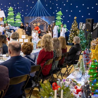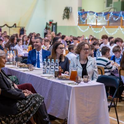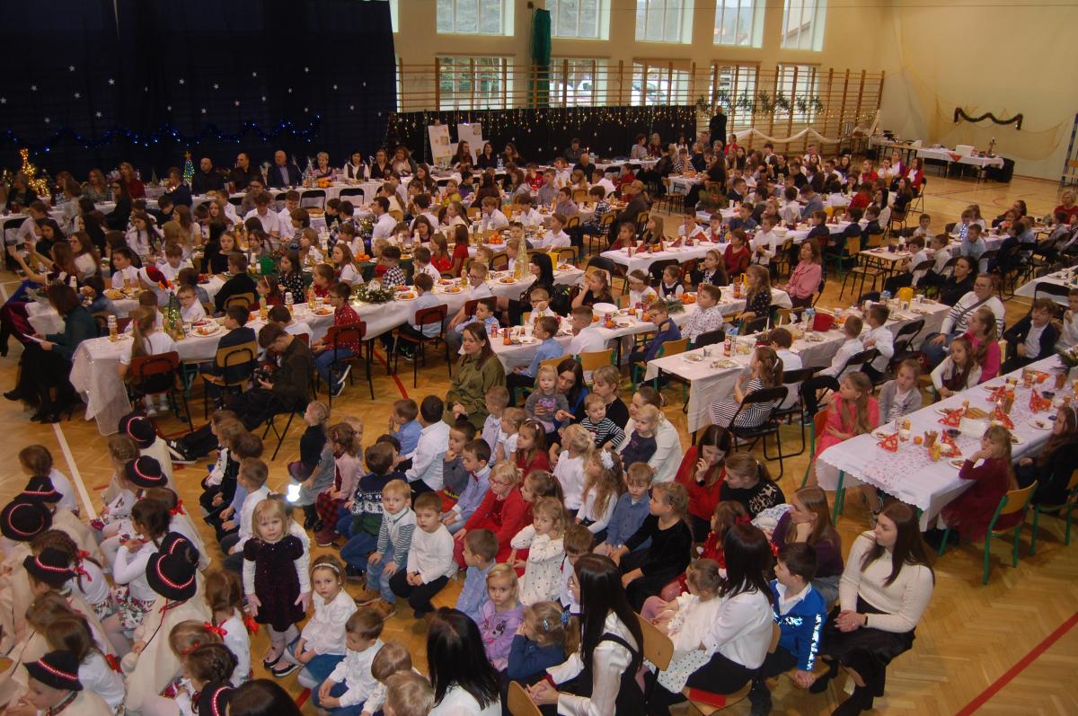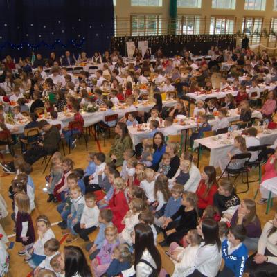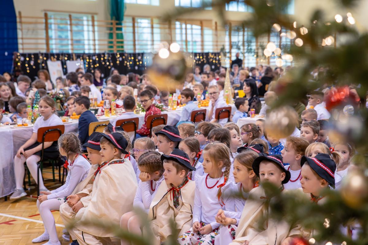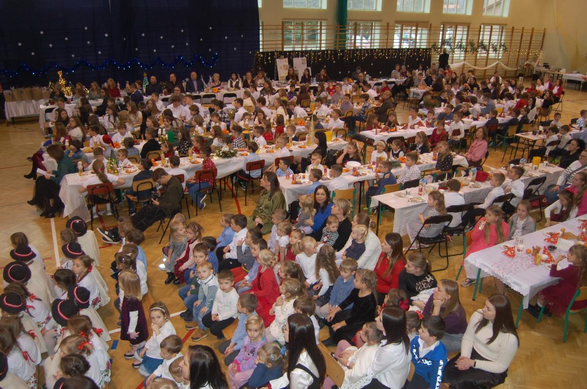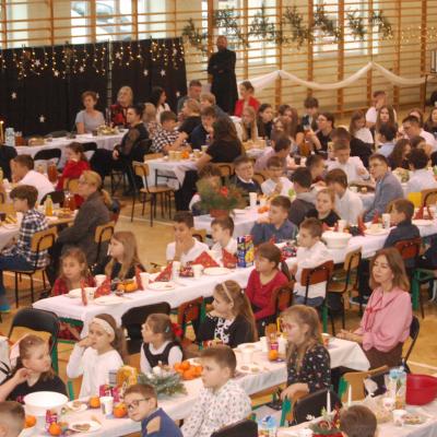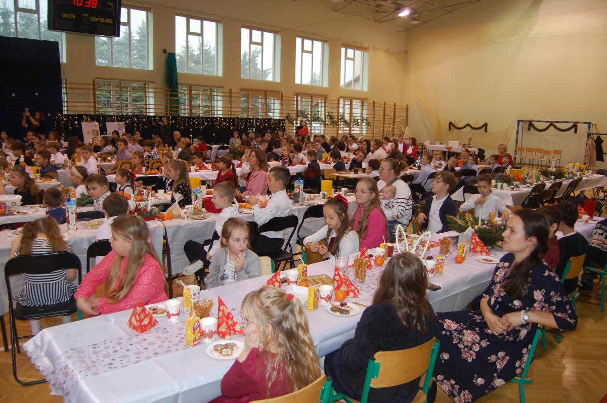 Po zakończonych występach wszyscy zebrani mieli okazję wspólnie spędzić czas przy wigilijnym stole. Nie zabrakło tradycyjnych potraw przygotowanych przez uczestników warsztatów kulinarnych – naszych uczniów – oraz różnorodnych słodkości, które dodatkowo umiliły to świąteczne spotkanie.