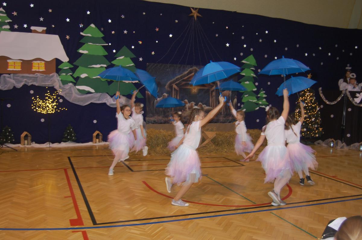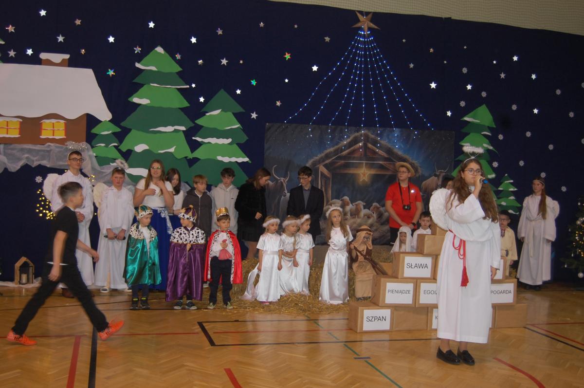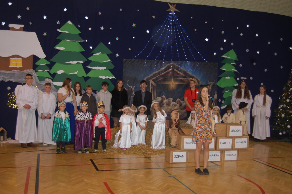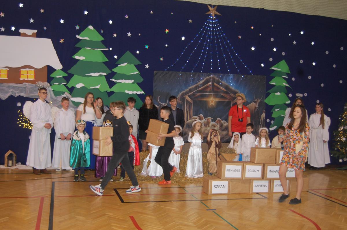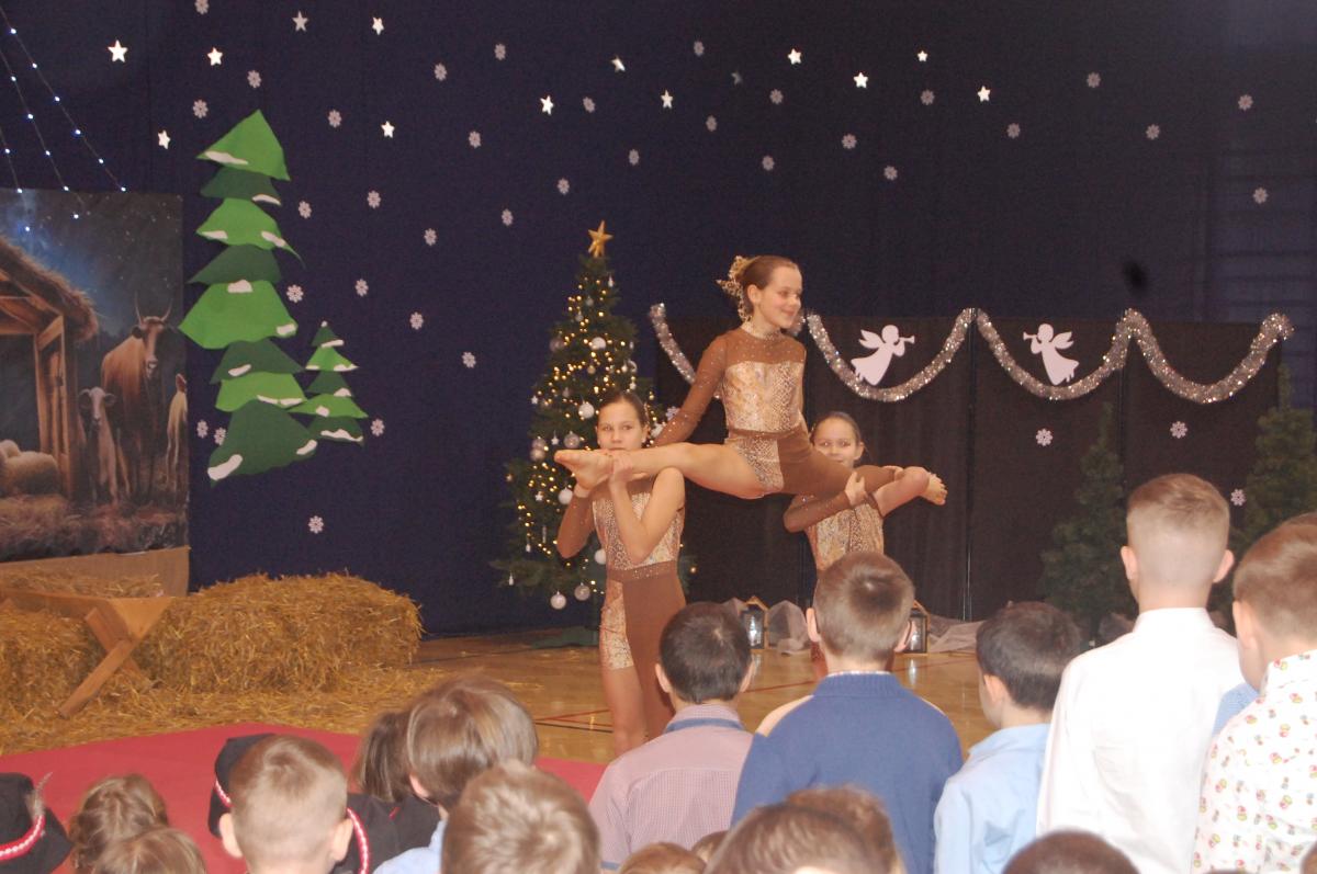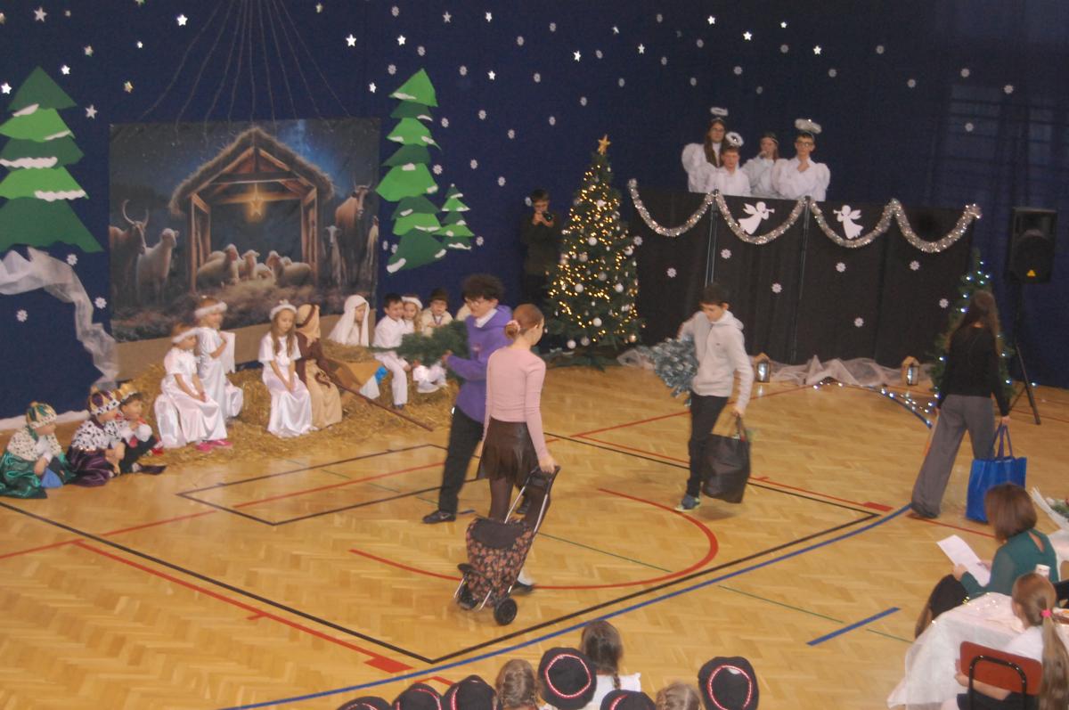 Występy obejmowały grę aktorską, taniec, śpiew oraz grę na instrumentach muzycznych, m.in. saksofonie, skrzypcach i akordeonie. Nie zabrakło również efektownego pokazu akrobatyki, który wzbudził podziw i entuzjazm publiczności. Każdy element przedstawienia był dowodem ogromnego zaangażowania, talentu i pracy naszych uczniów. Całość dopełniała starannie i kunsztownie wykonana dekoracja oraz scenografia, które wprowadziły wszystkich uczestników w wyjątkową, świąteczną atmosferę.