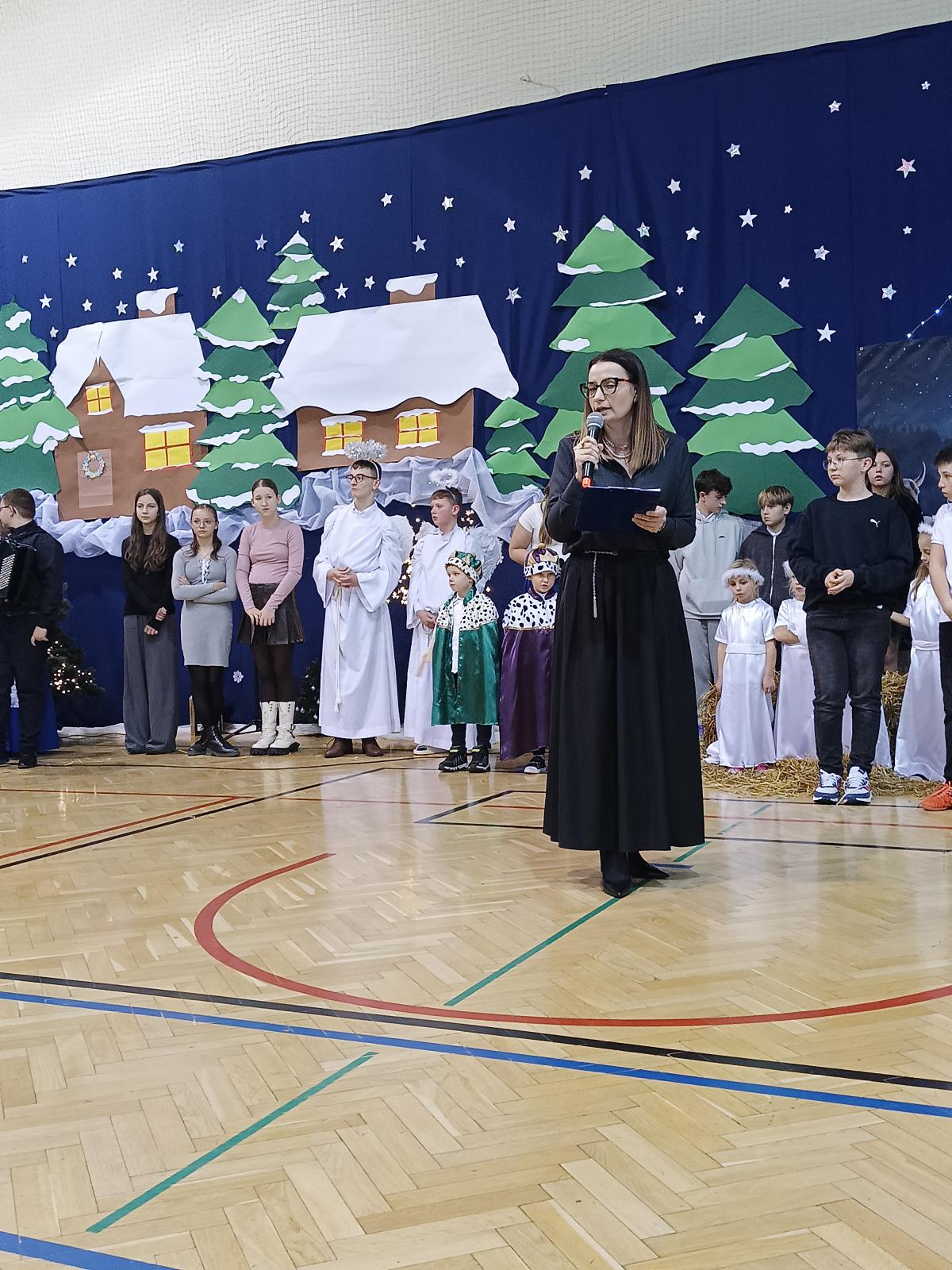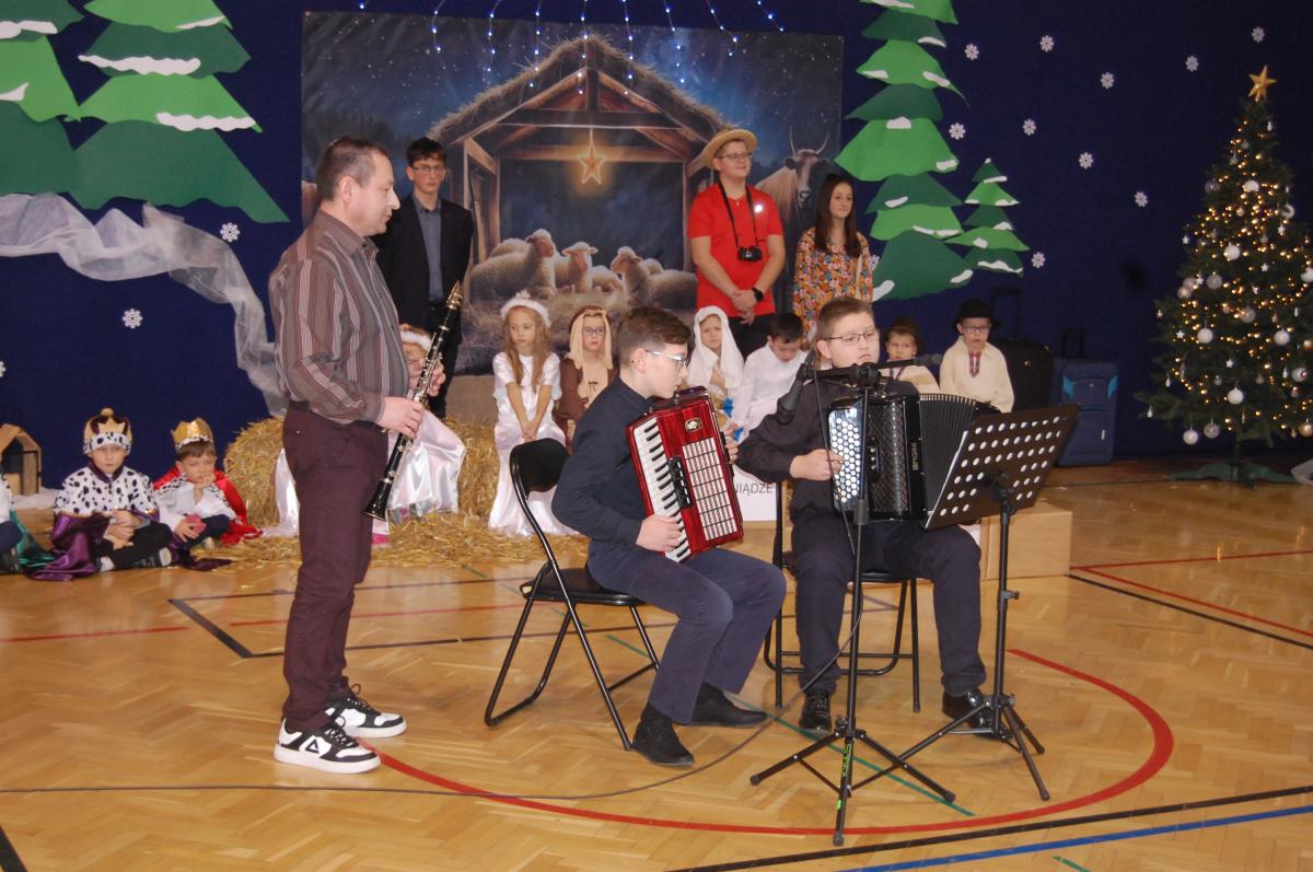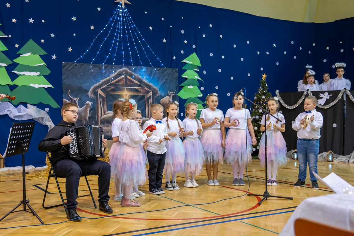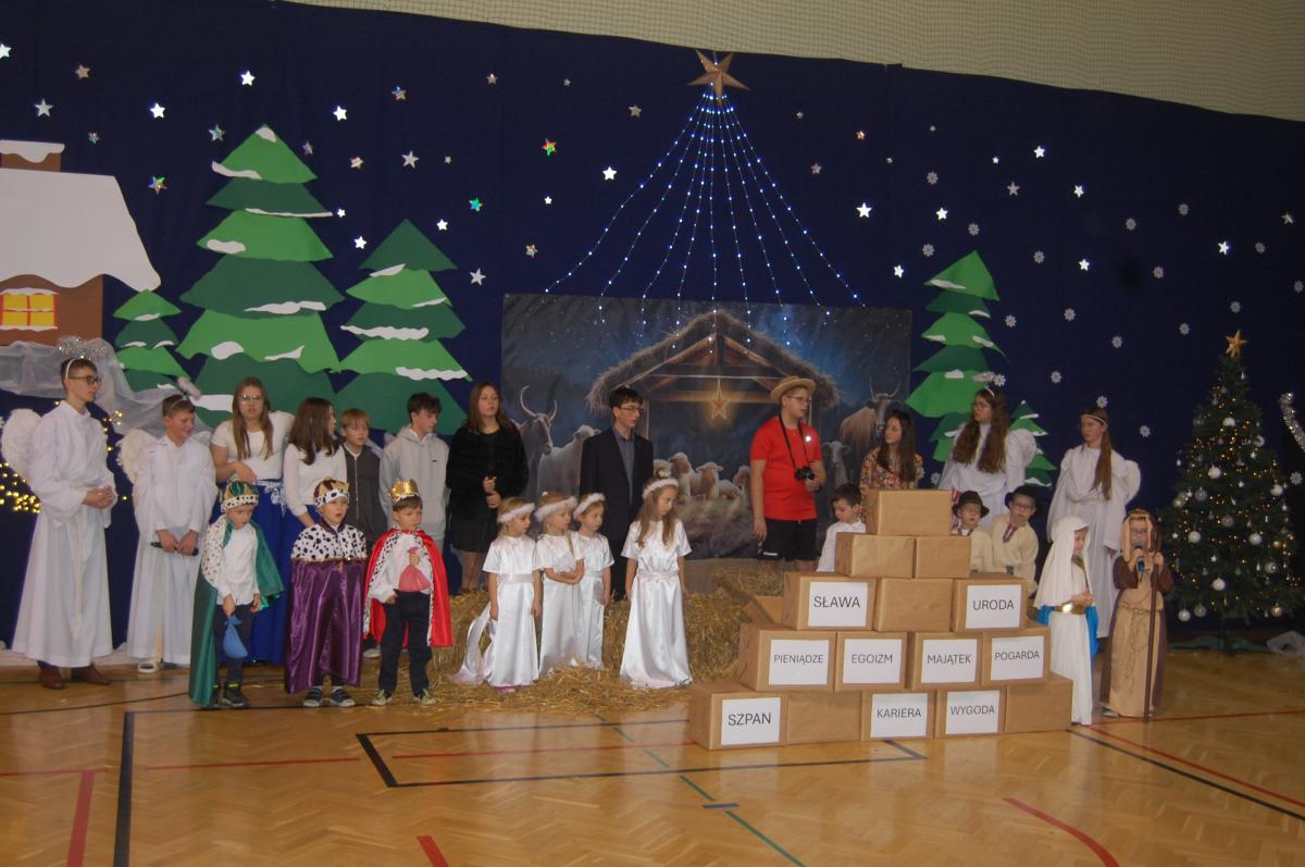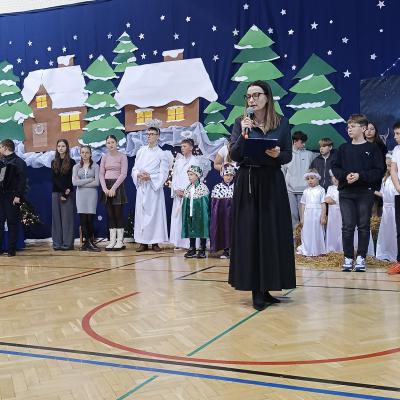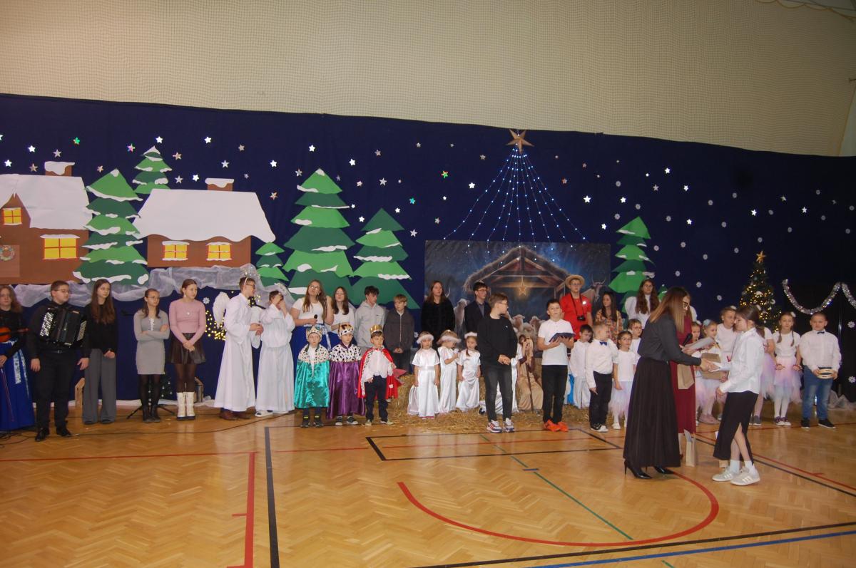 Występy obejmowały grę aktorską, taniec, śpiew oraz grę na instrumentach muzycznych, m.in. saksofonie, skrzypcach i akordeonie. Nie zabrakło również efektownego pokazu akrobatyki, który wzbudził podziw i entuzjazm publiczności. Każdy element przedstawienia był dowodem ogromnego zaangażowania, talentu i pracy naszych uczniów. Całość dopełniała starannie i kunsztownie wykonana dekoracja oraz scenografia, które wprowadziły wszystkich uczestników w wyjątkową, świąteczną atmosferę.