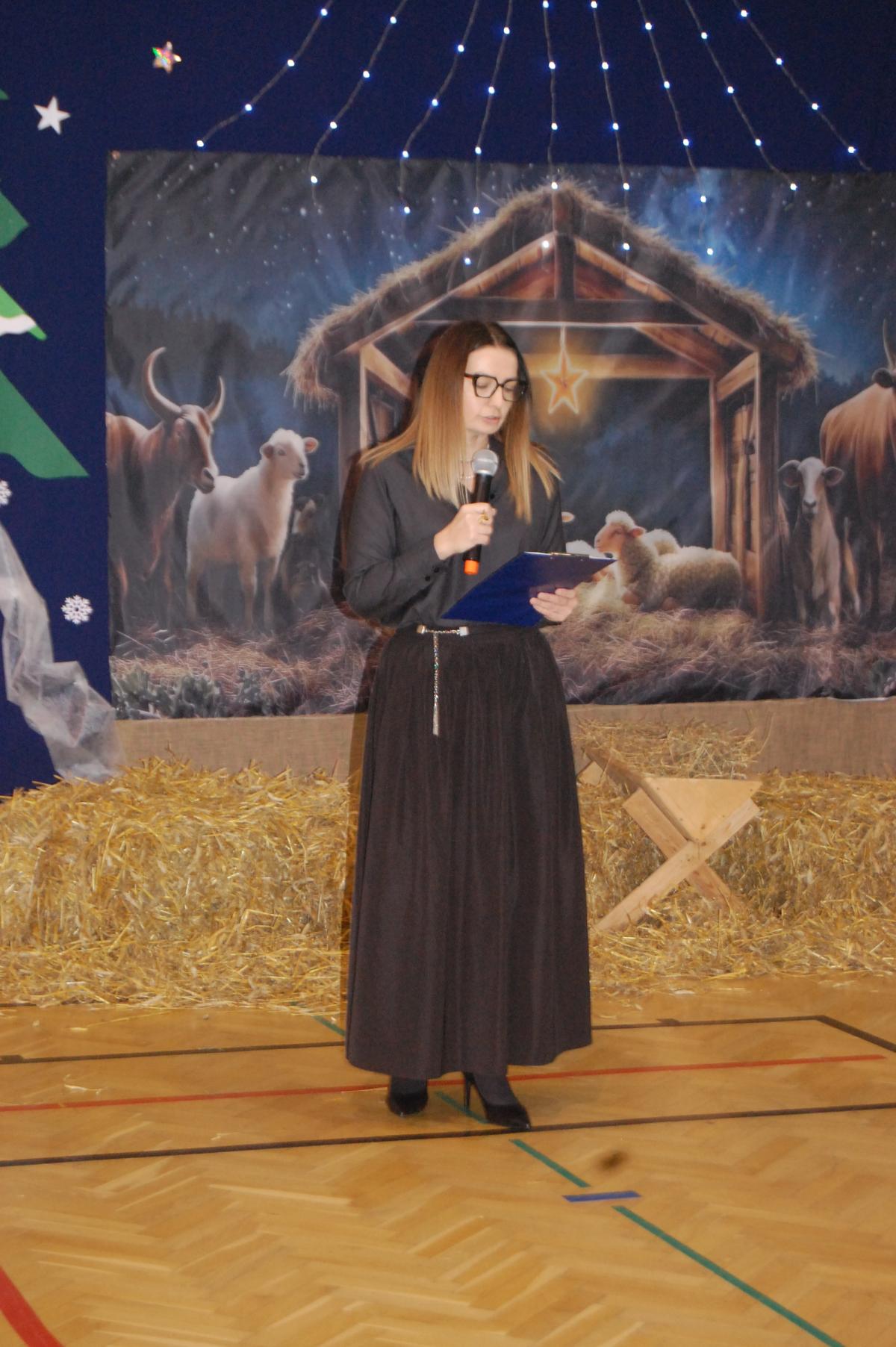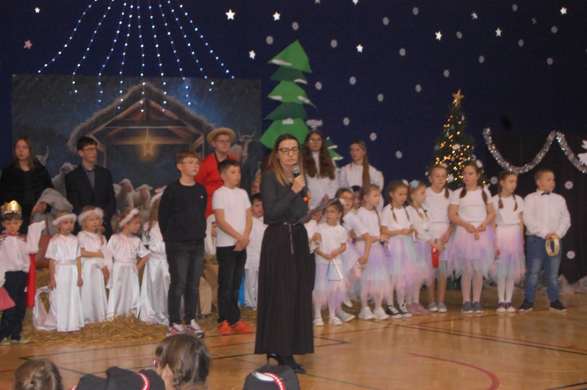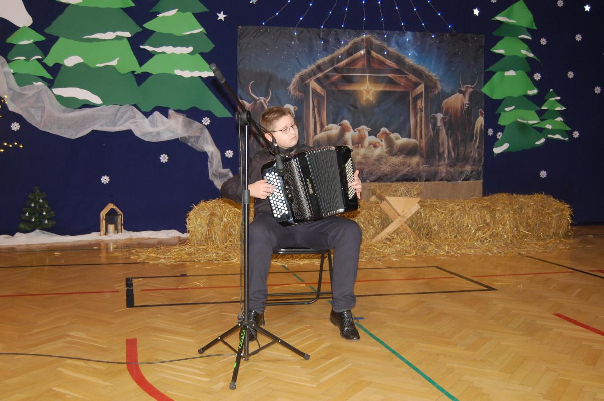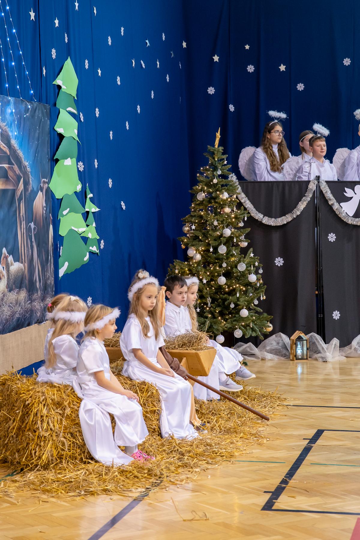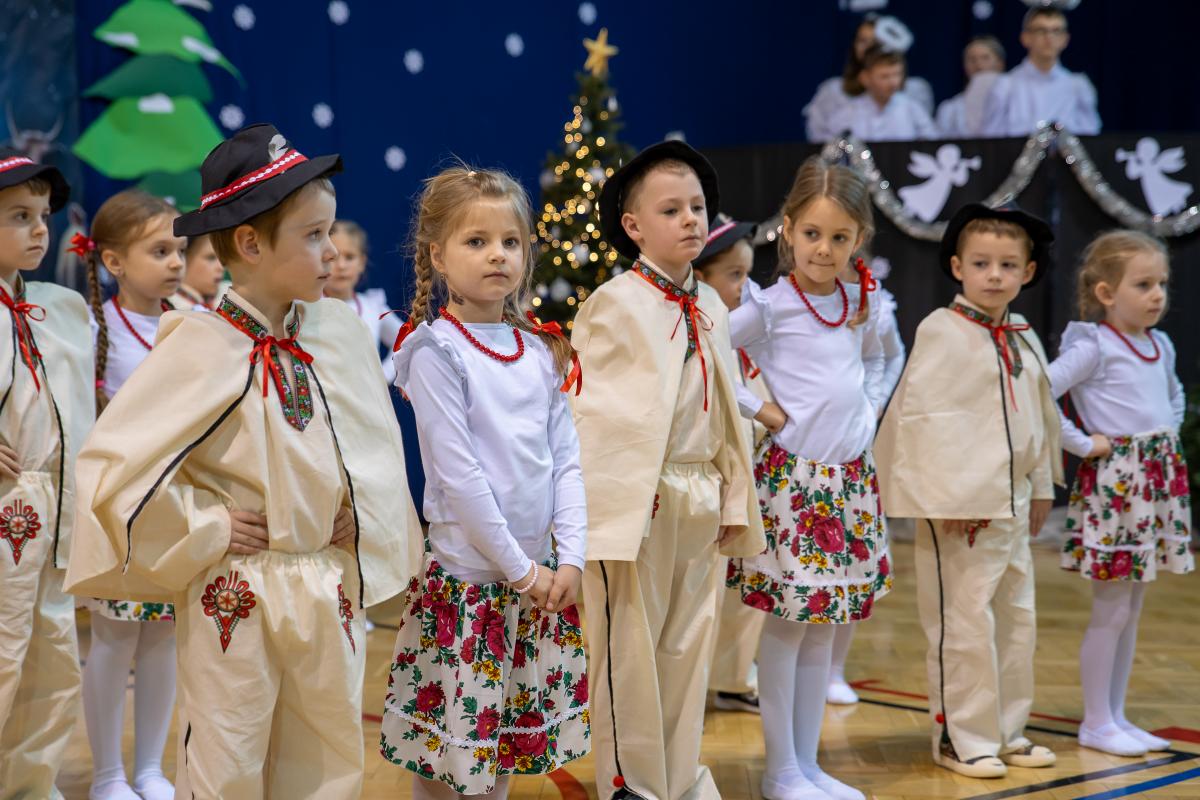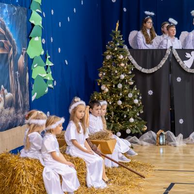 Występy obejmowały grę aktorską, taniec, śpiew oraz grę na instrumentach muzycznych, m.in. saksofonie, skrzypcach i akordeonie. Nie zabrakło również efektownego pokazu akrobatyki, który wzbudził podziw i entuzjazm publiczności. Każdy element przedstawienia był dowodem ogromnego zaangażowania, talentu i pracy naszych uczniów. Całość dopełniała starannie i kunsztownie wykonana dekoracja oraz scenografia, które wprowadziły wszystkich uczestników w wyjątkową, świąteczną atmosferę.