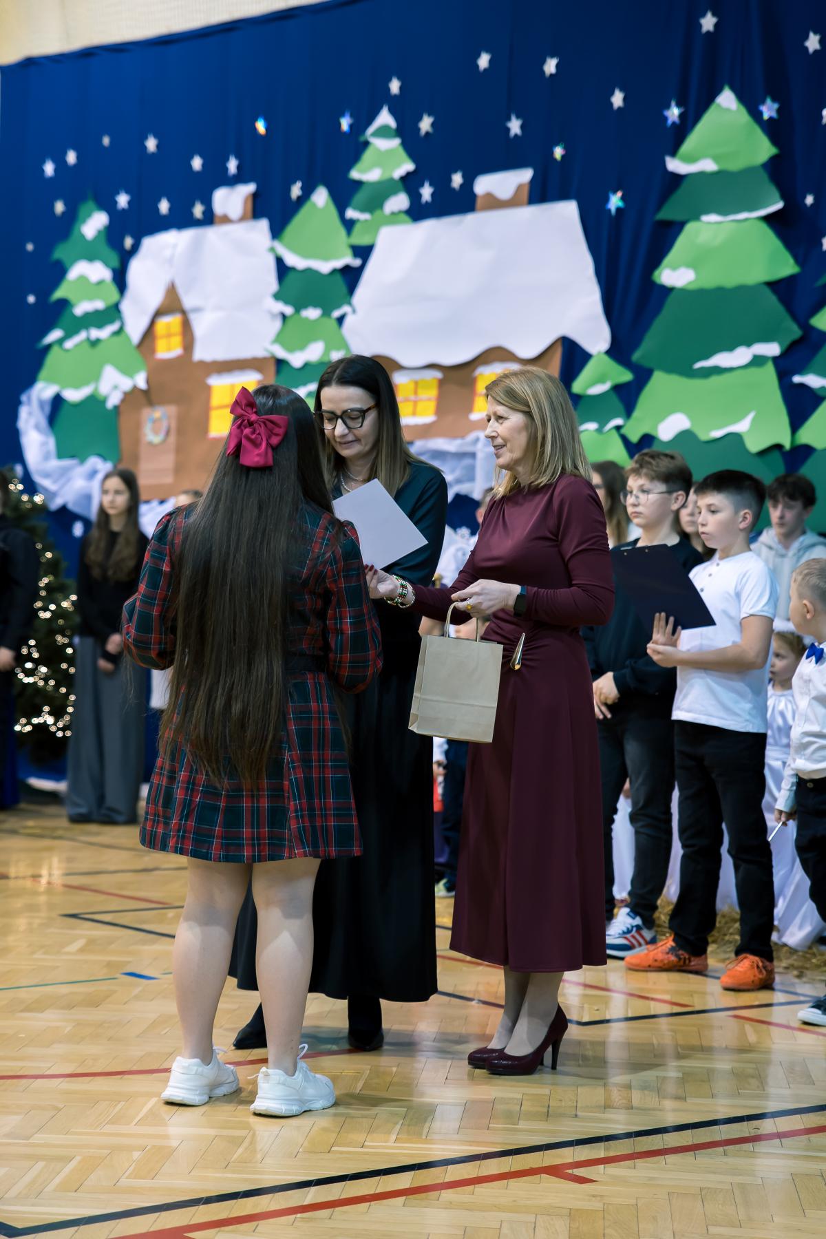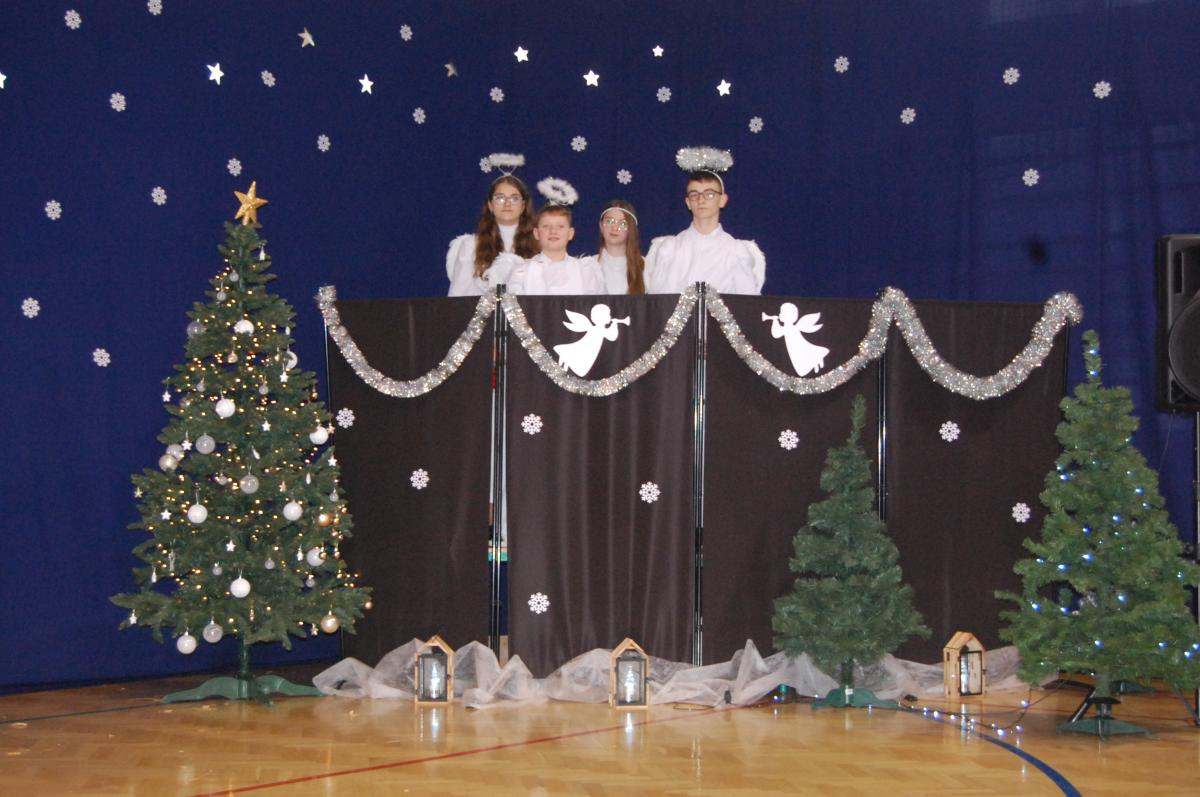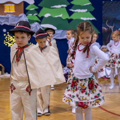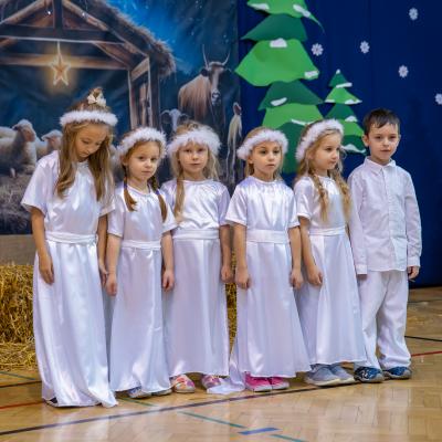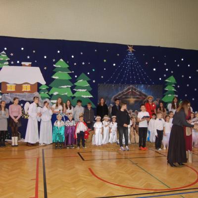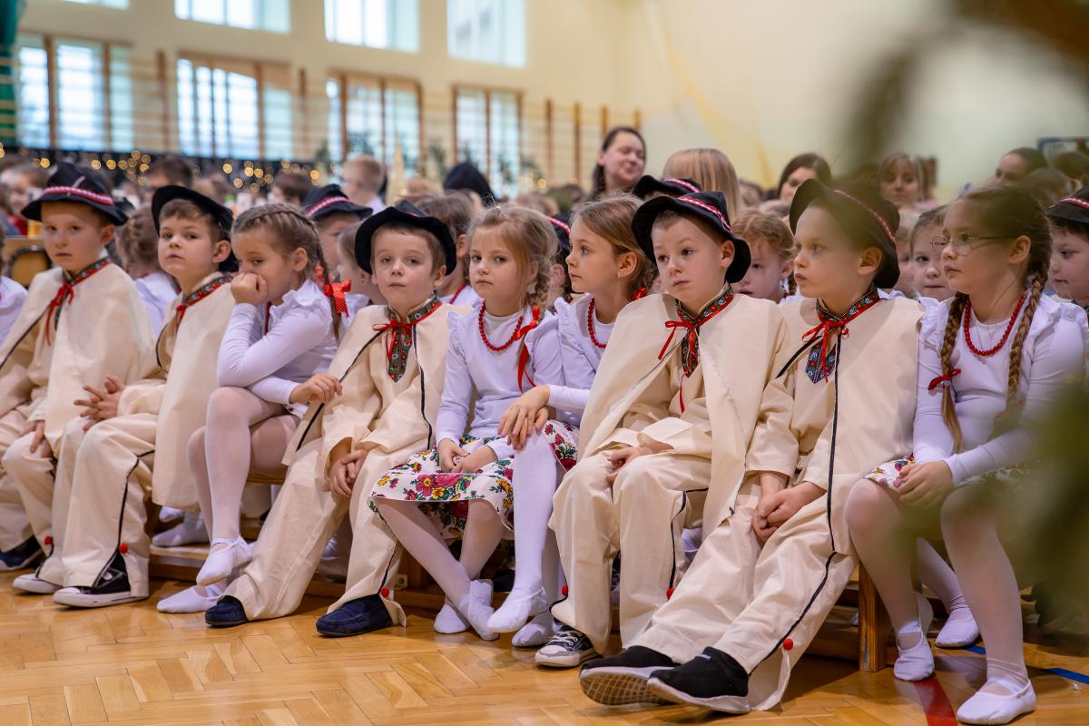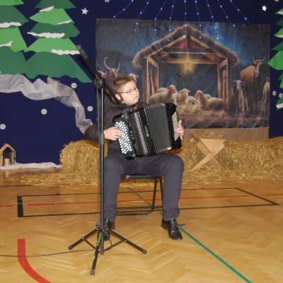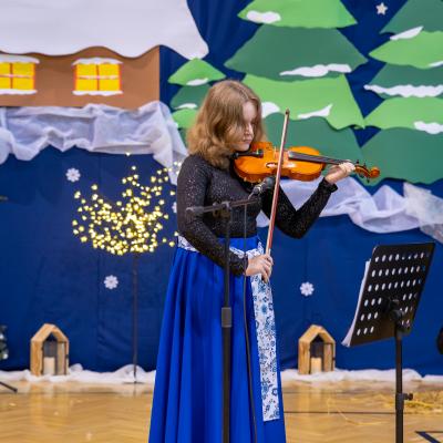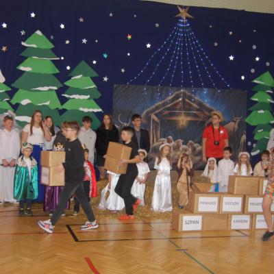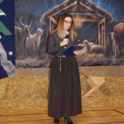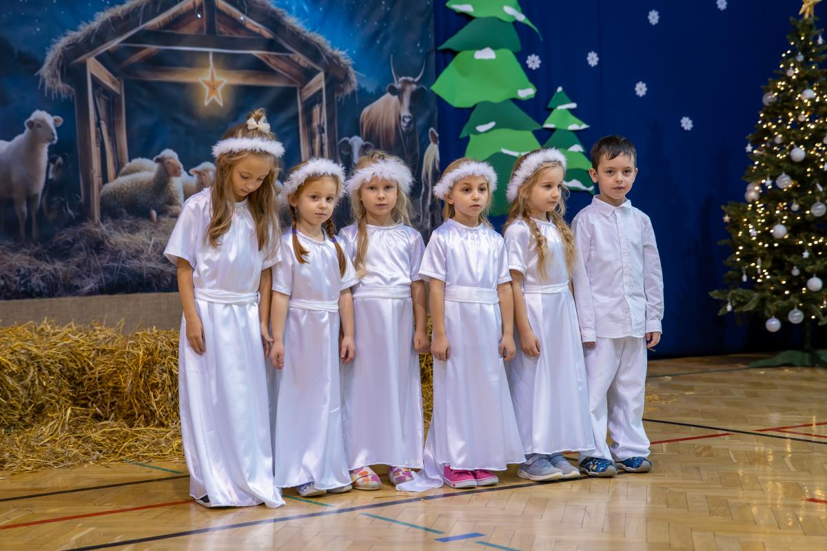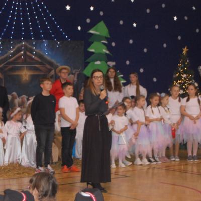 Występy obejmowały grę aktorską, taniec, śpiew oraz grę na instrumentach muzycznych, m.in. saksofonie, skrzypcach i akordeonie. Nie zabrakło również efektownego pokazu akrobatyki, który wzbudził podziw i entuzjazm publiczności. Każdy element przedstawienia był dowodem ogromnego zaangażowania, talentu i pracy naszych uczniów. Całość dopełniała starannie i kunsztownie wykonana dekoracja oraz scenografia, które wprowadziły wszystkich uczestników w wyjątkową, świąteczną atmosferę.
