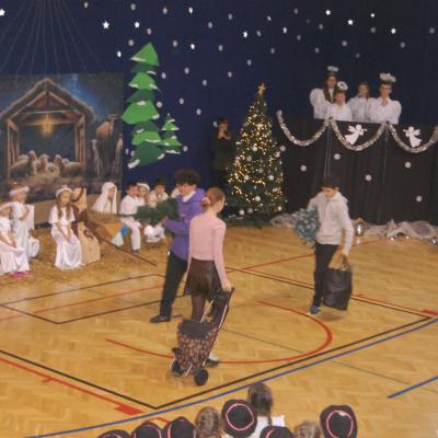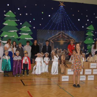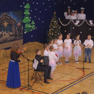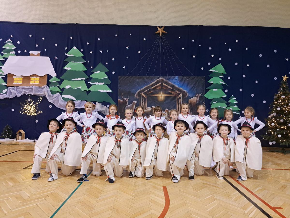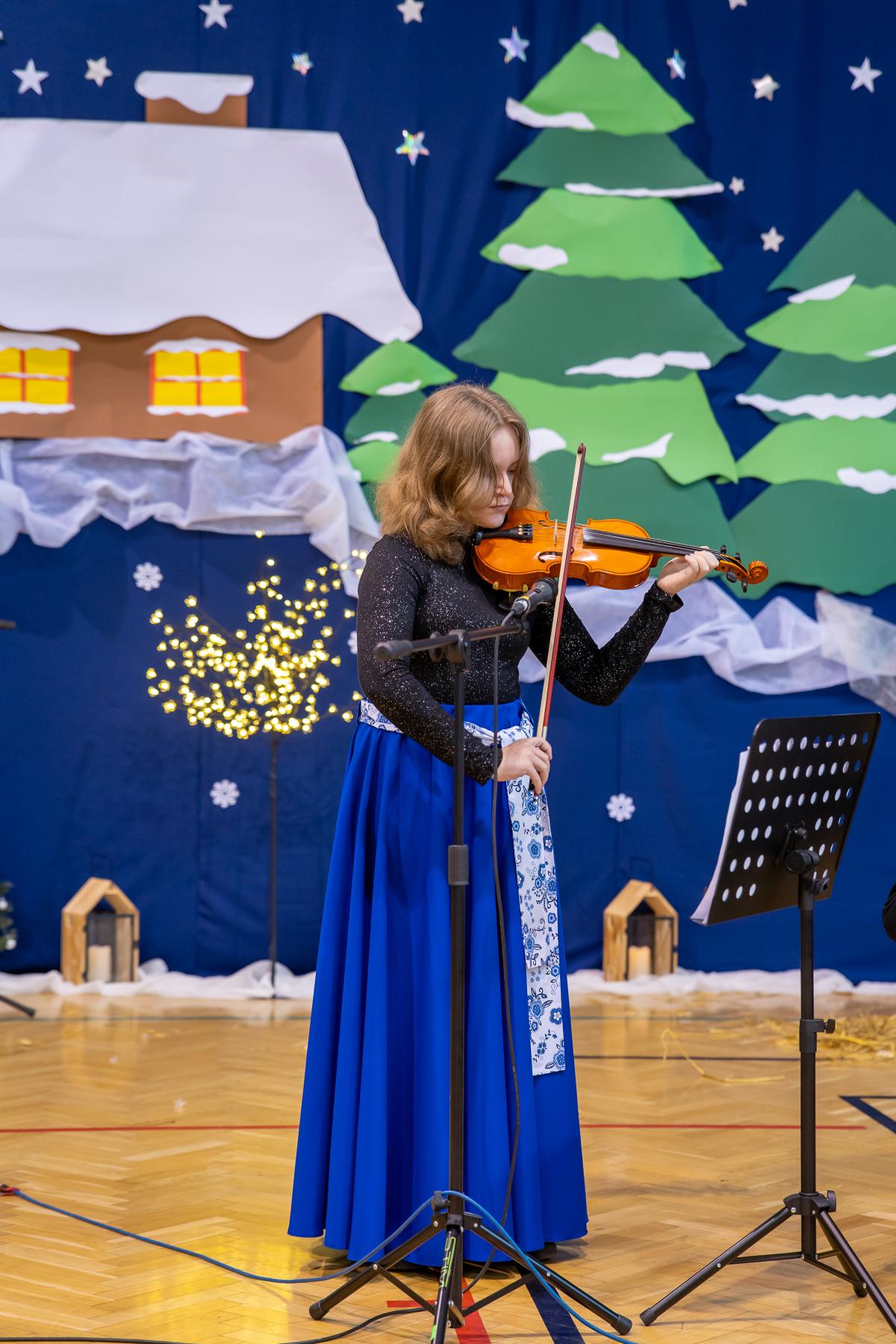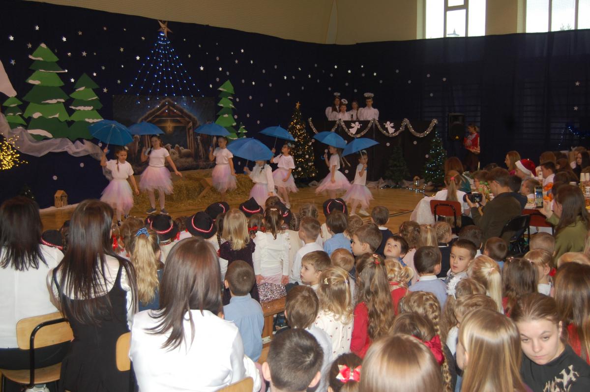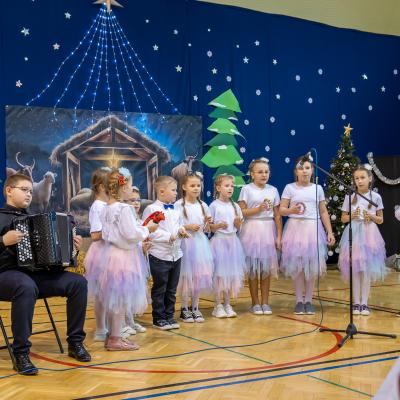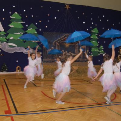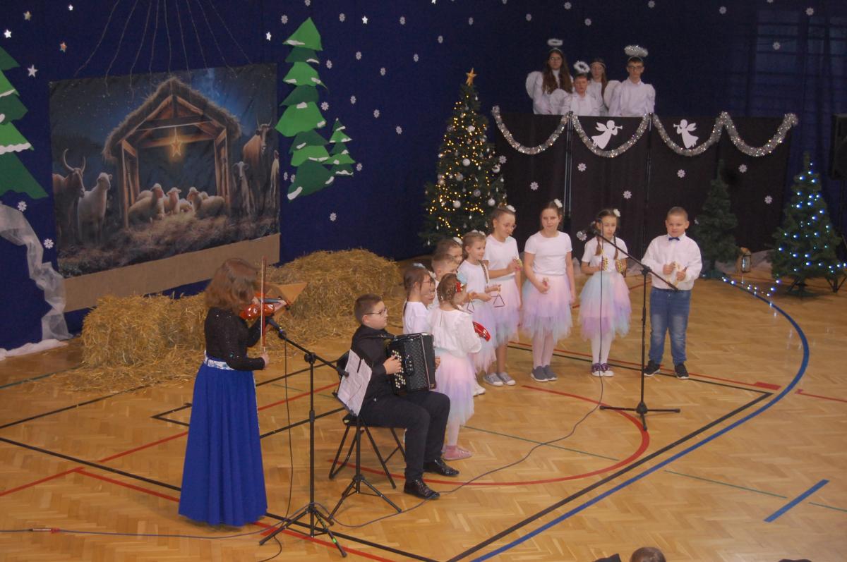 Występy obejmowały grę aktorską, taniec, śpiew oraz grę na instrumentach muzycznych, m.in. saksofonie, skrzypcach i akordeonie. Nie zabrakło również efektownego pokazu akrobatyki, który wzbudził podziw i entuzjazm publiczności. Każdy element przedstawienia był dowodem ogromnego zaangażowania, talentu i pracy naszych uczniów. Całość dopełniała starannie i kunsztownie wykonana dekoracja oraz scenografia, które wprowadziły wszystkich uczestników w wyjątkową, świąteczną atmosferę.