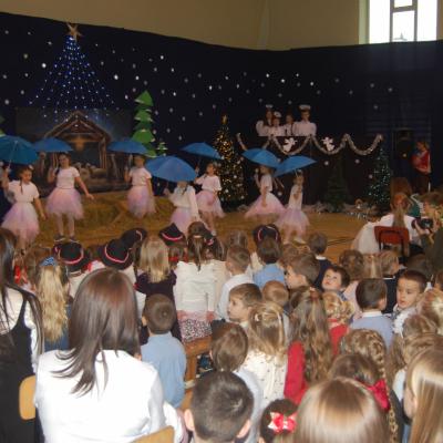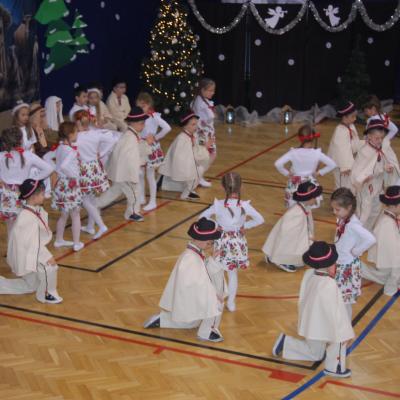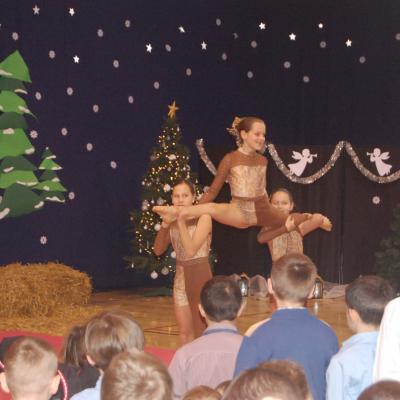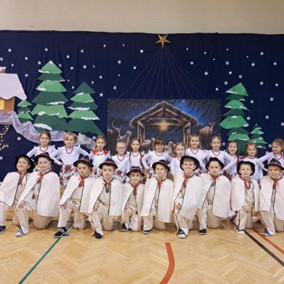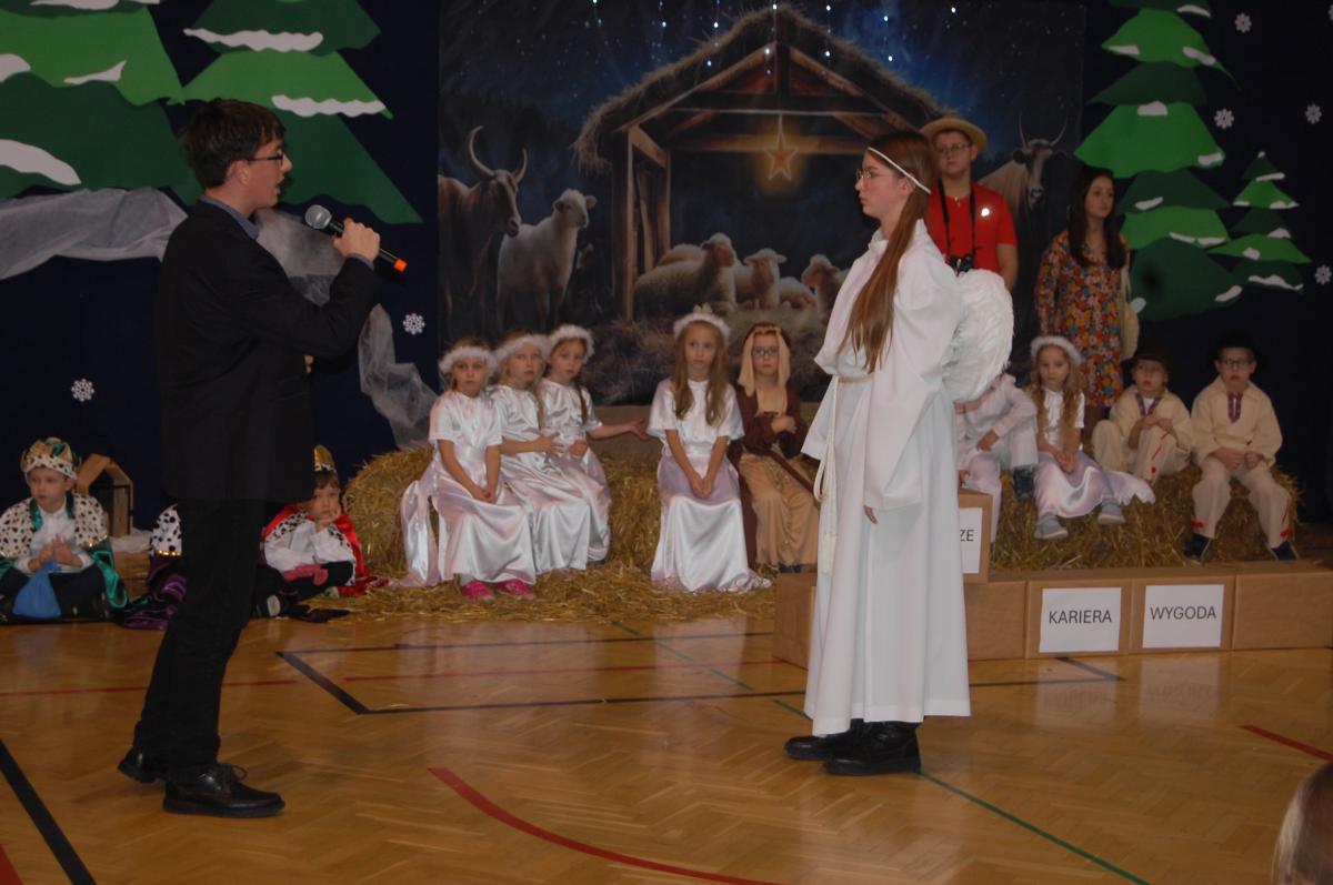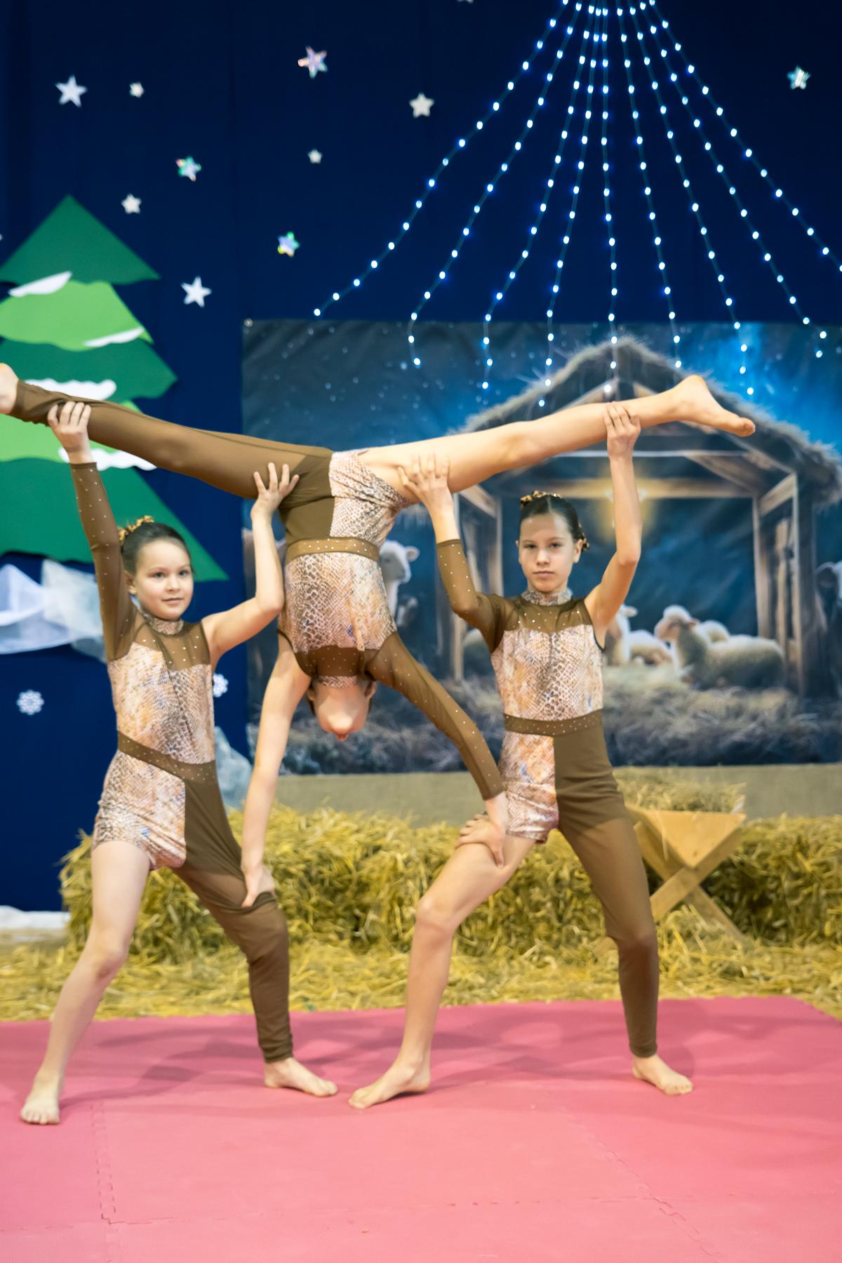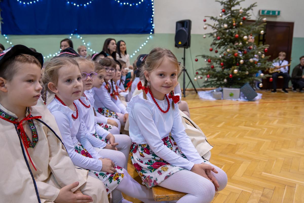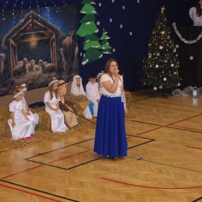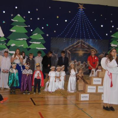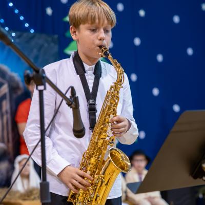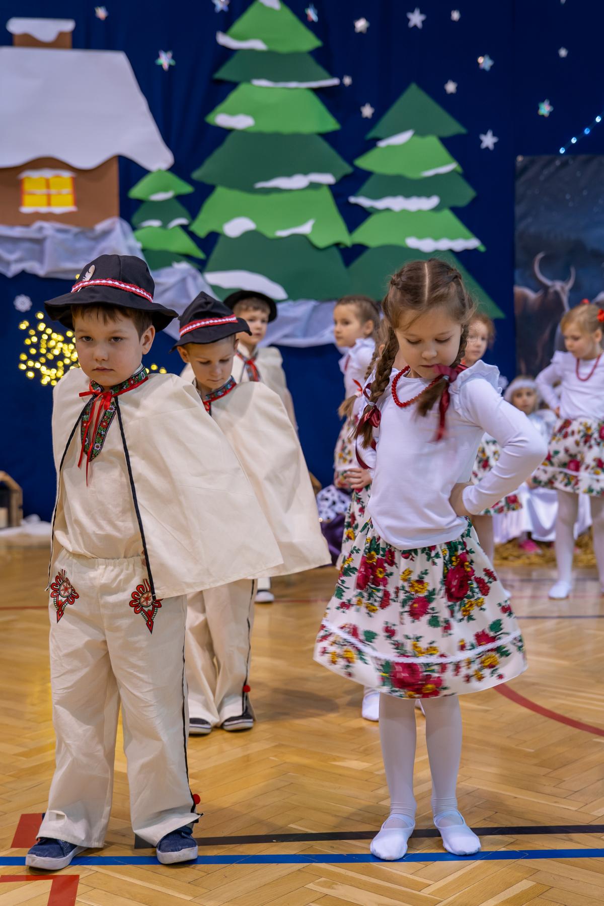 Występy obejmowały grę aktorską, taniec, śpiew oraz grę na instrumentach muzycznych, m.in. saksofonie, skrzypcach i akordeonie. Nie zabrakło również efektownego pokazu akrobatyki, który wzbudził podziw i entuzjazm publiczności. Każdy element przedstawienia był dowodem ogromnego zaangażowania, talentu i pracy naszych uczniów. Całość dopełniała starannie i kunsztownie wykonana dekoracja oraz scenografia, które wprowadziły wszystkich uczestników w wyjątkową, świąteczną atmosferę.