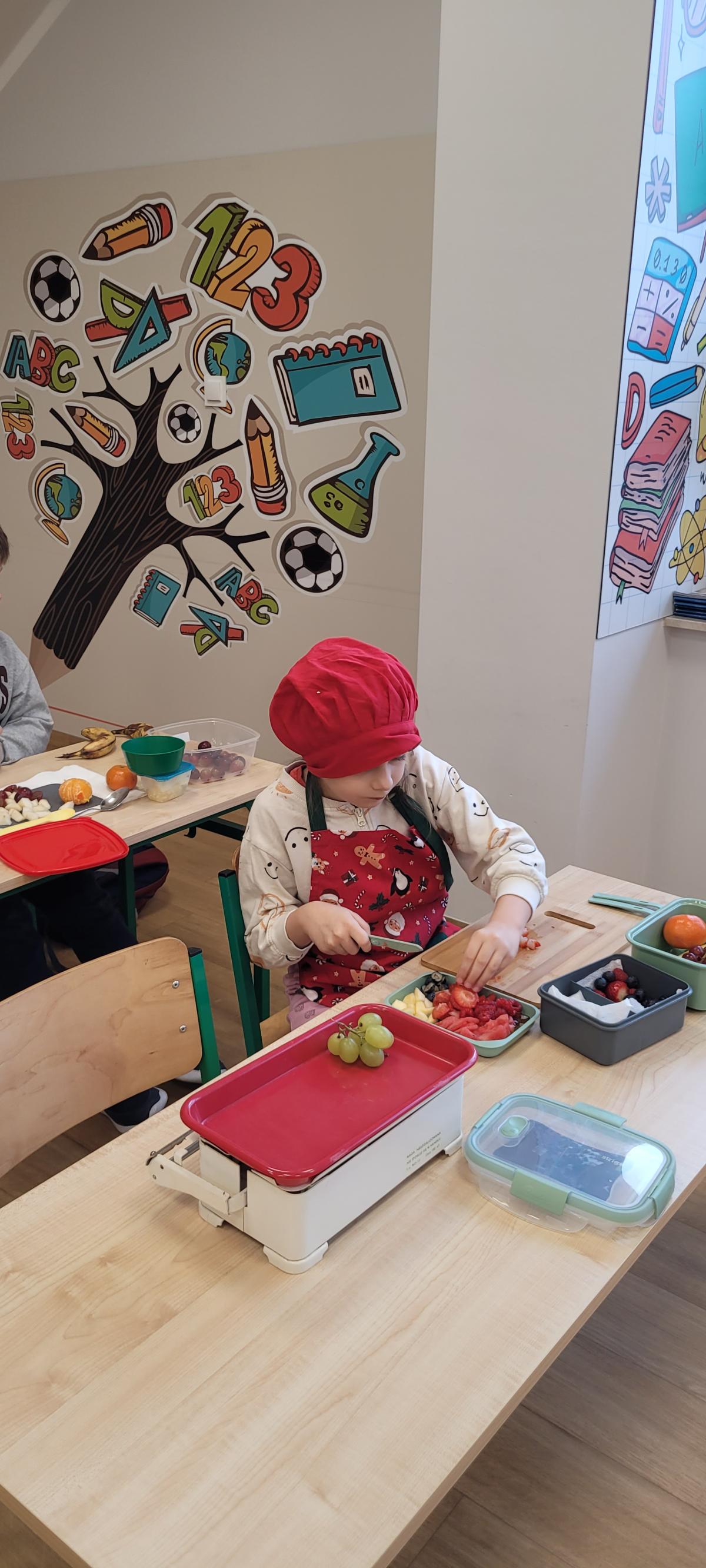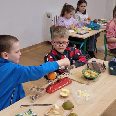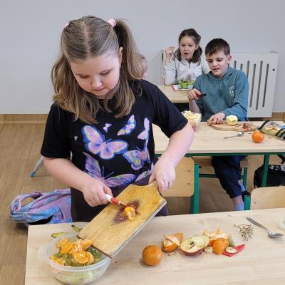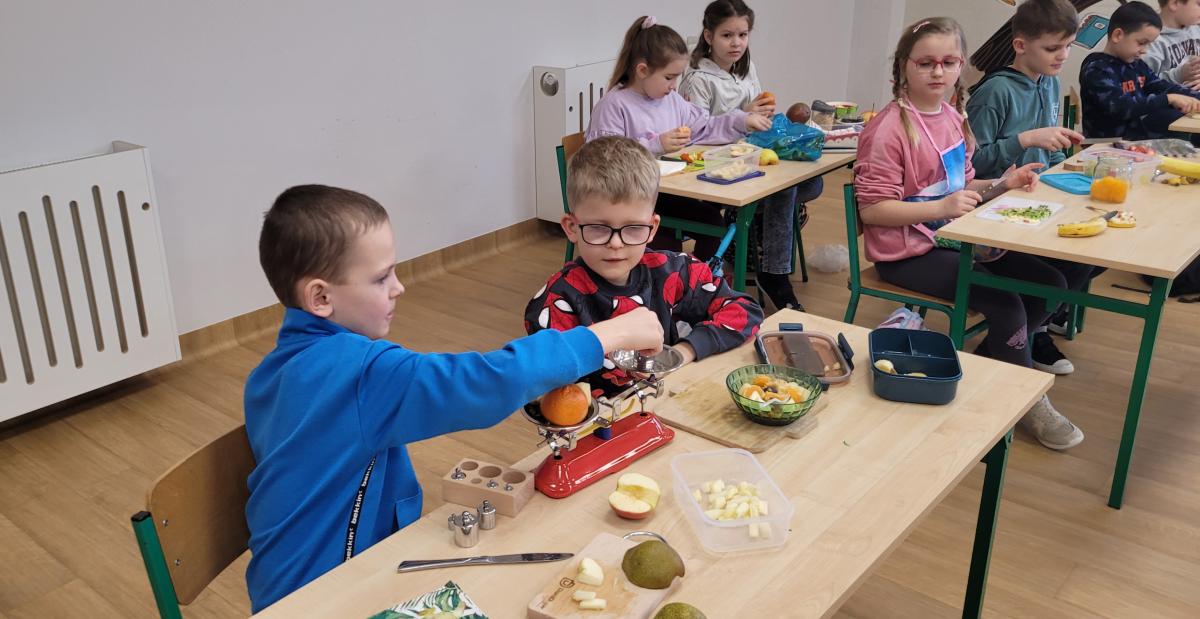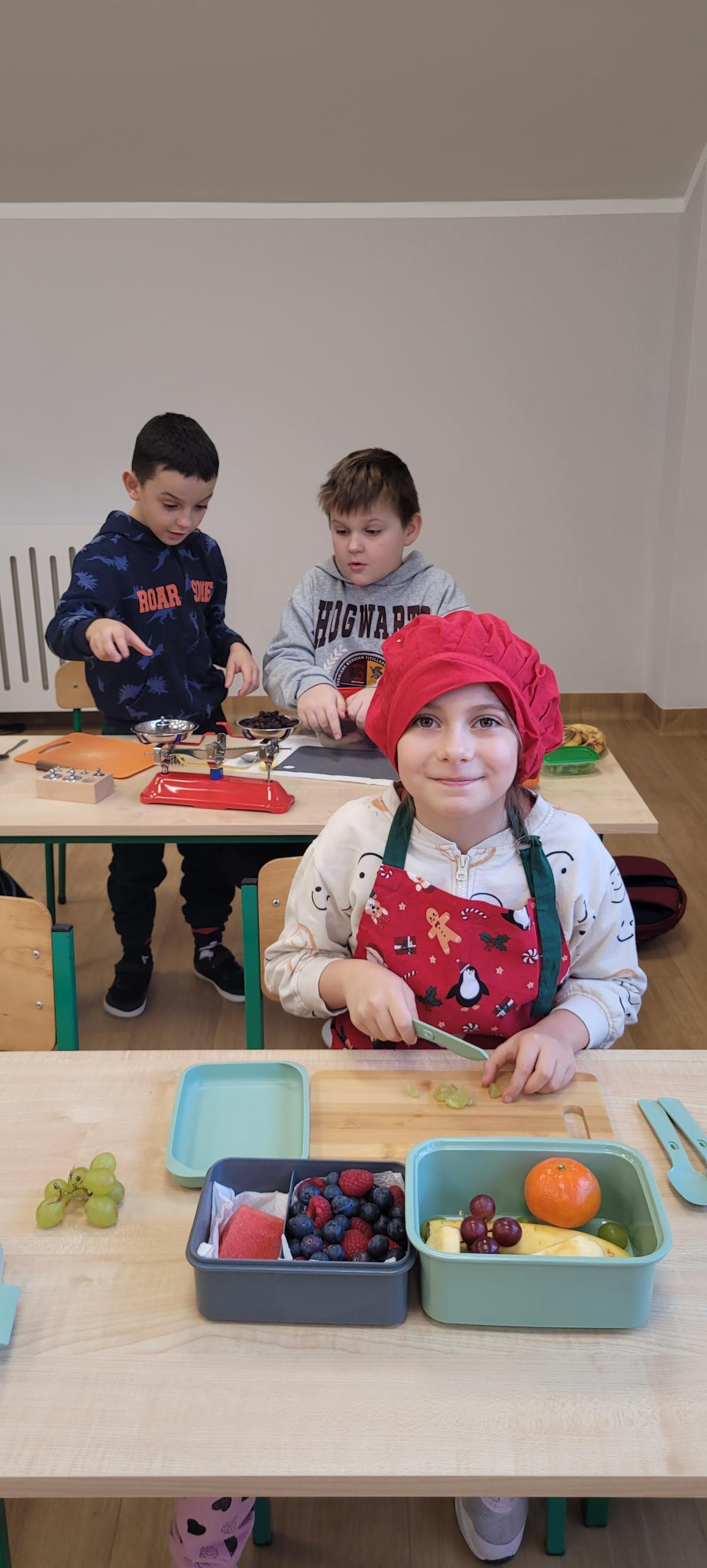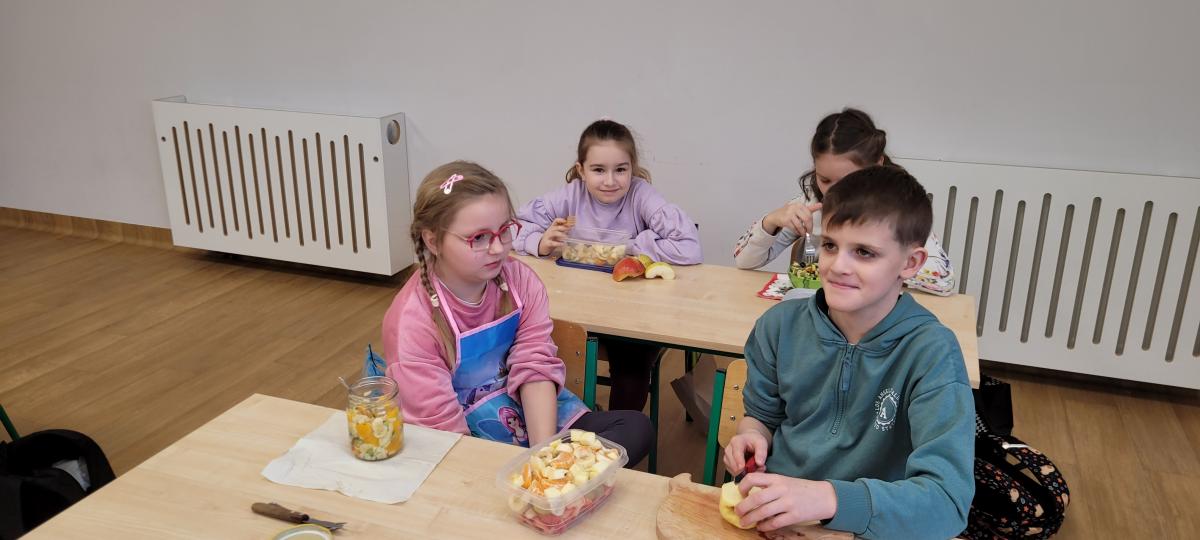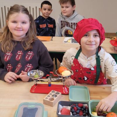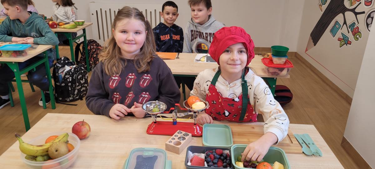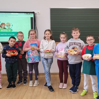 W styczniu realizowaliśmy wyjątkowy moduł, gdyż matematyki szukaliśmy w… kuchni. Uczyliśmy się: obliczania proporcji i ilości składników, planowania budżetu na zakup produktów, odmierzania, porównywania, jednostek miary i zasad bezpiecznej pracy. W efekcie powstały kolorowe, zdrowe i smaczne sałatki owocowe. Okazało się, że nauka może być atrakcyjna i przyjemna.