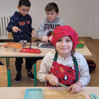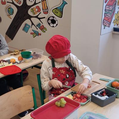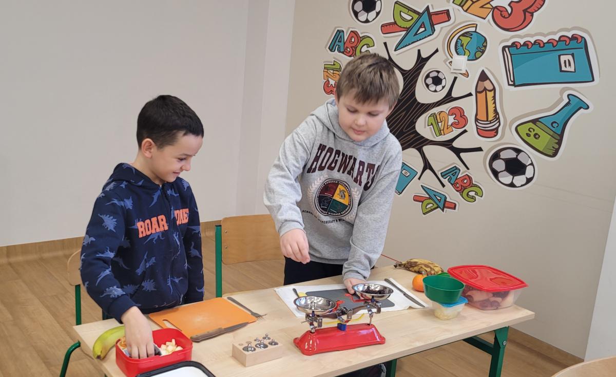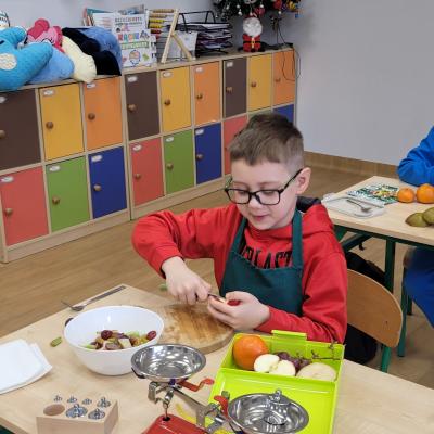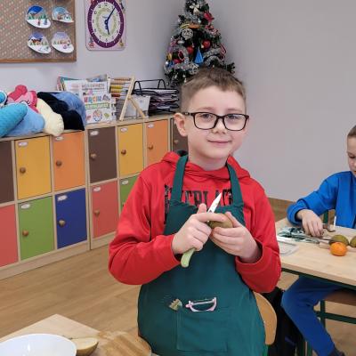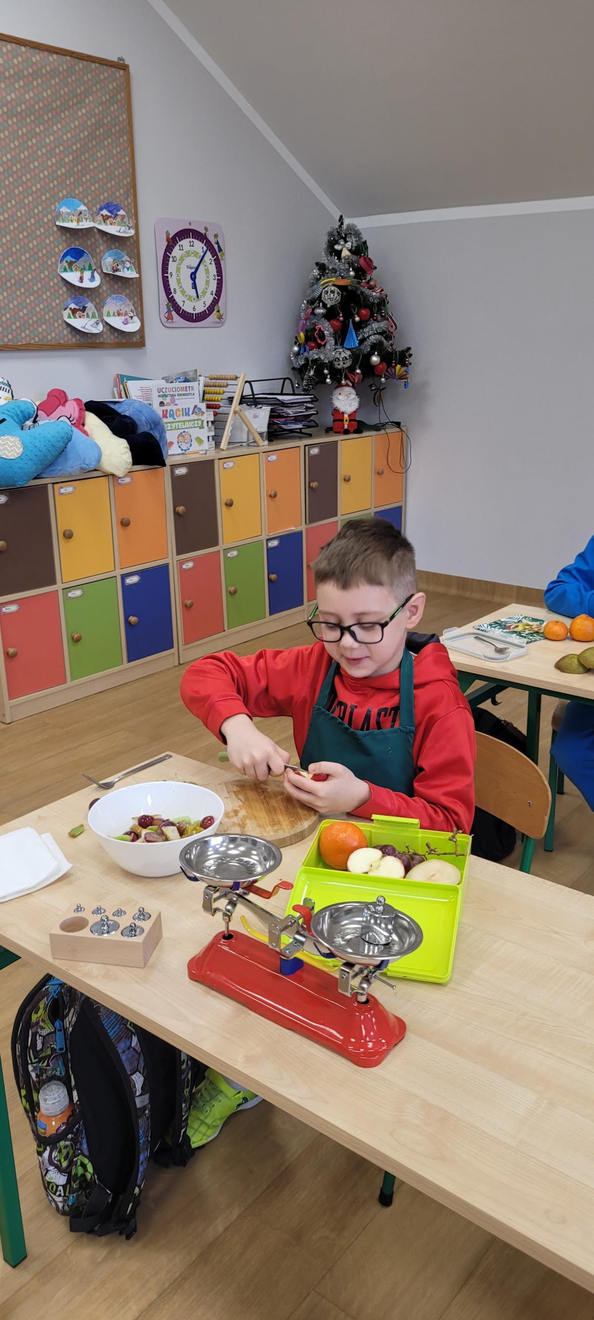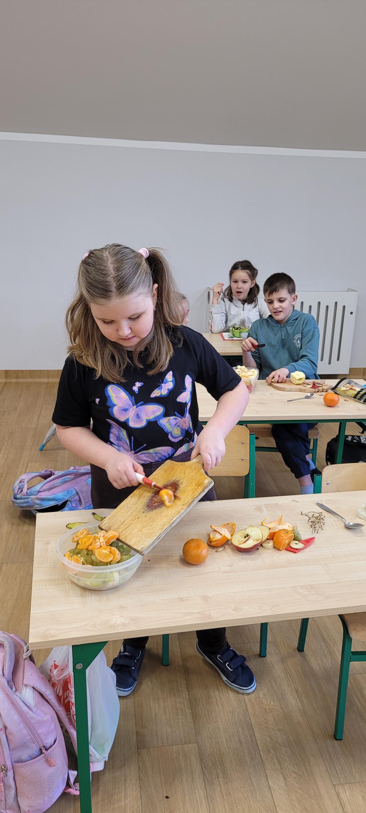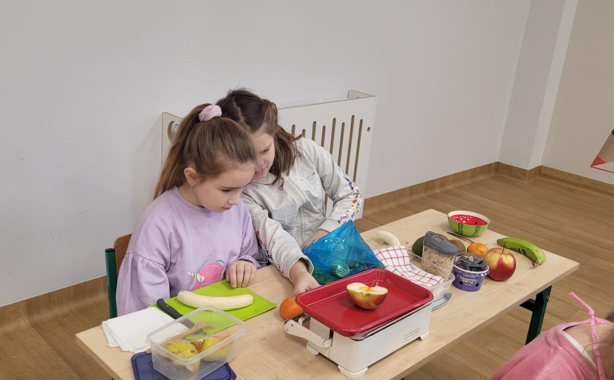 W styczniu realizowaliśmy wyjątkowy moduł, gdyż matematyki szukaliśmy w… kuchni. Uczyliśmy się: obliczania proporcji i ilości składników, planowania budżetu na zakup produktów, odmierzania, porównywania, jednostek miary i zasad bezpiecznej pracy. W efekcie powstały kolorowe, zdrowe i smaczne sałatki owocowe. Okazało się, że nauka może być atrakcyjna i przyjemna.