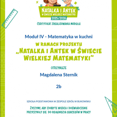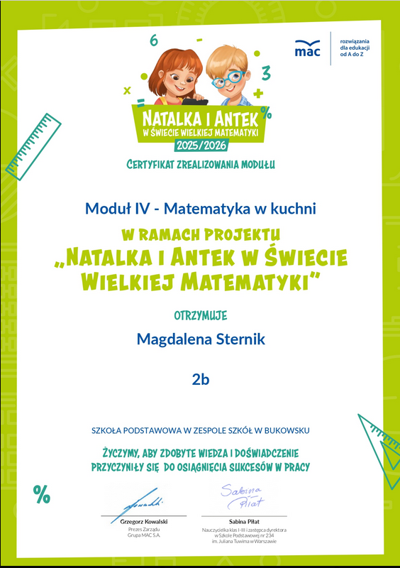 Uczniowie klas II wraz Natalką i Antkiem - bohaterami projektu „Natalka i Antek w świecie wielkiej matematyki”, dowiedzieli się, że matematyka jest obecna nie tylko w zeszytach i na tablicy, ale we wszystkich dziedzinach życia.