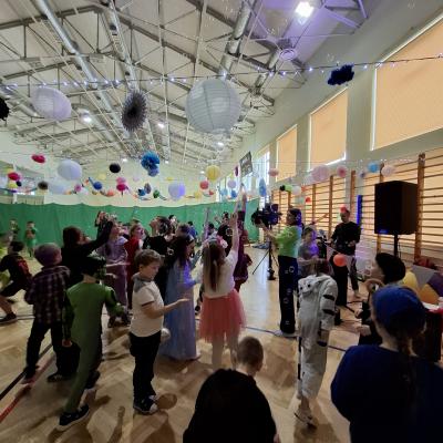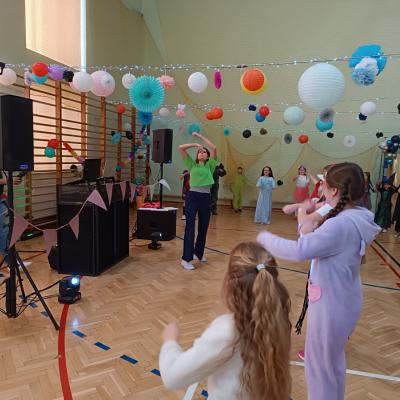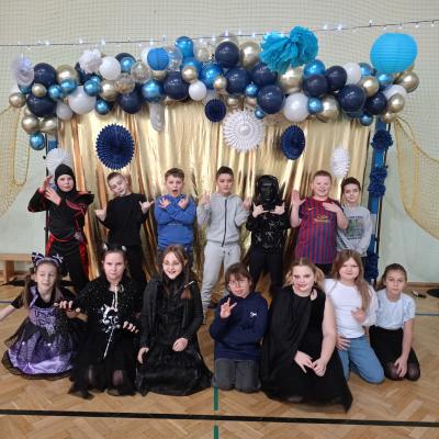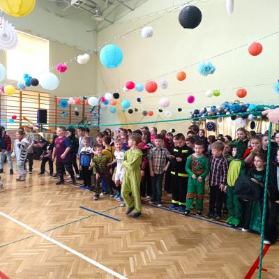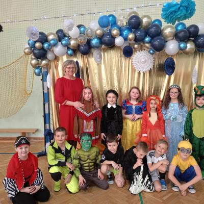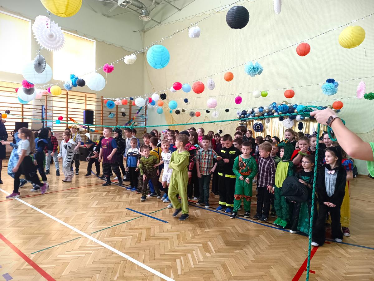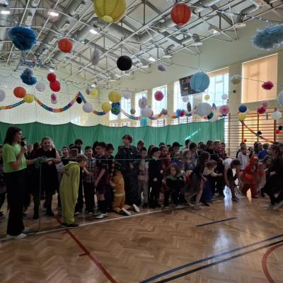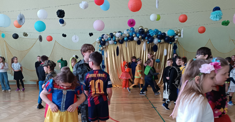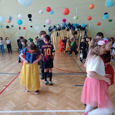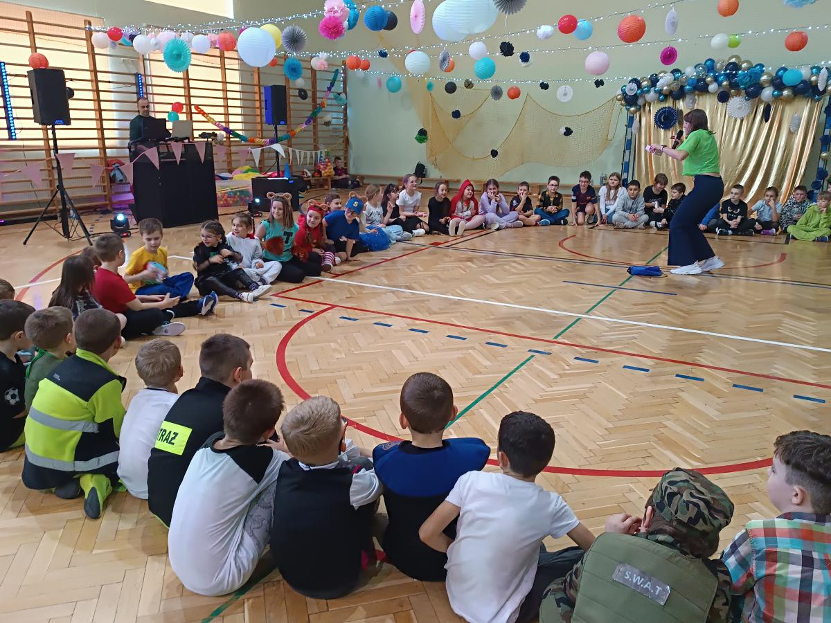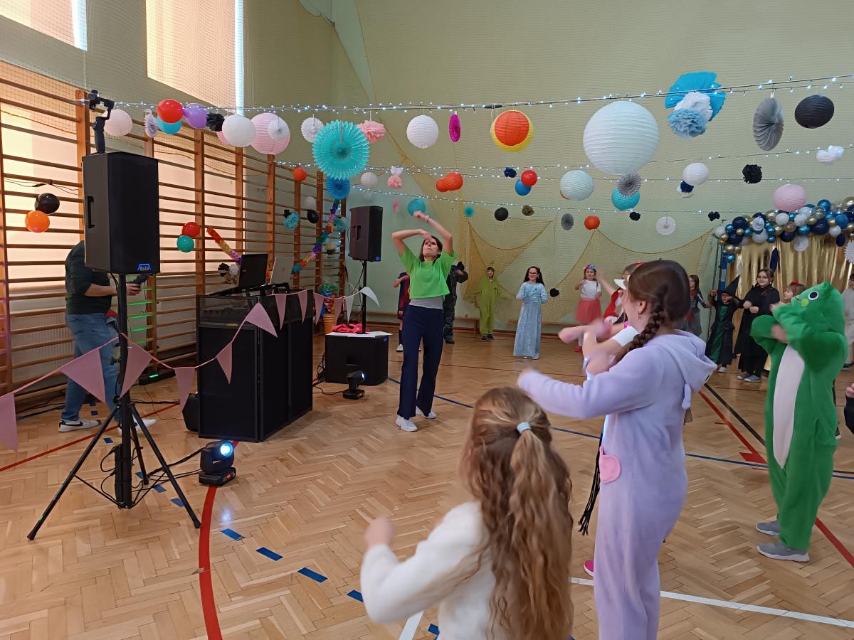 W naszej szkole odbył się bal karnawałowy dla uczniów klas I–III. Tego dnia sala wypełniła się muzyką, śmiechem i kolorami. O świetną oprawę muzyczną zadbał DJ, który puszczał ulubione hity dziecięce, zachęcając wszystkich do tańca.