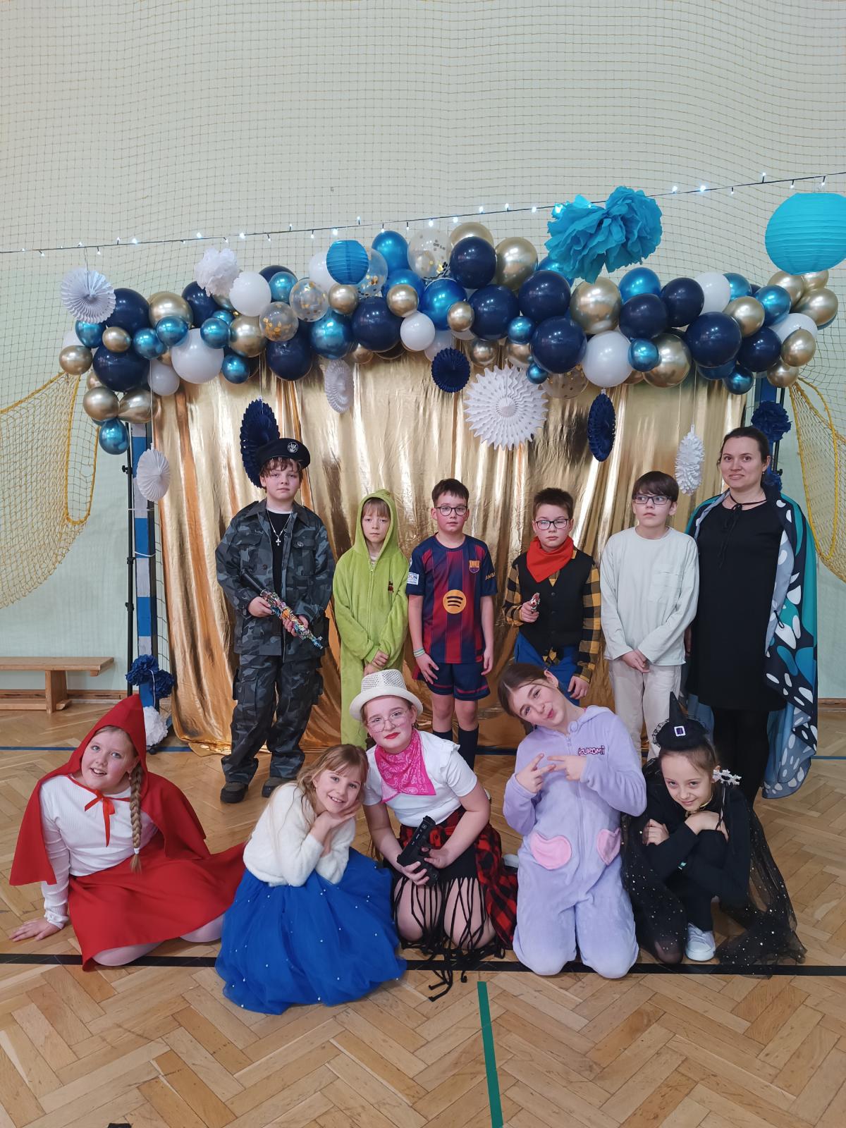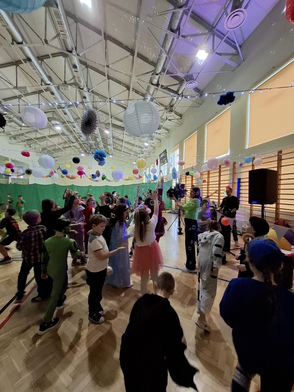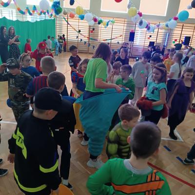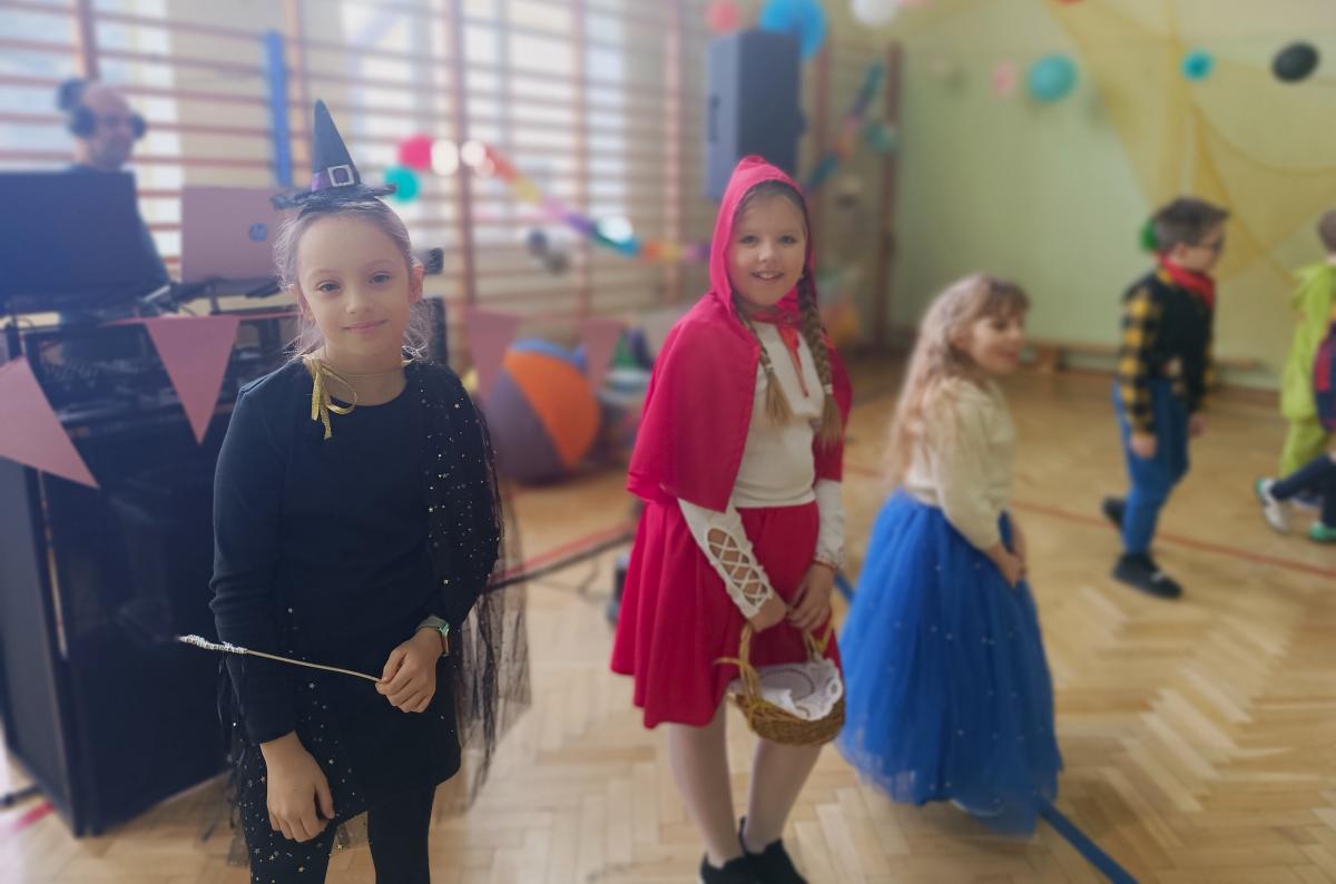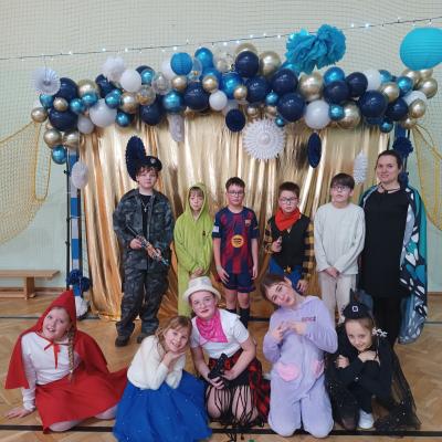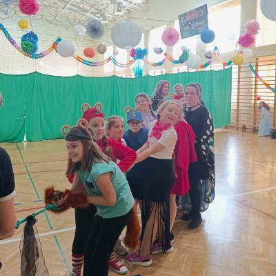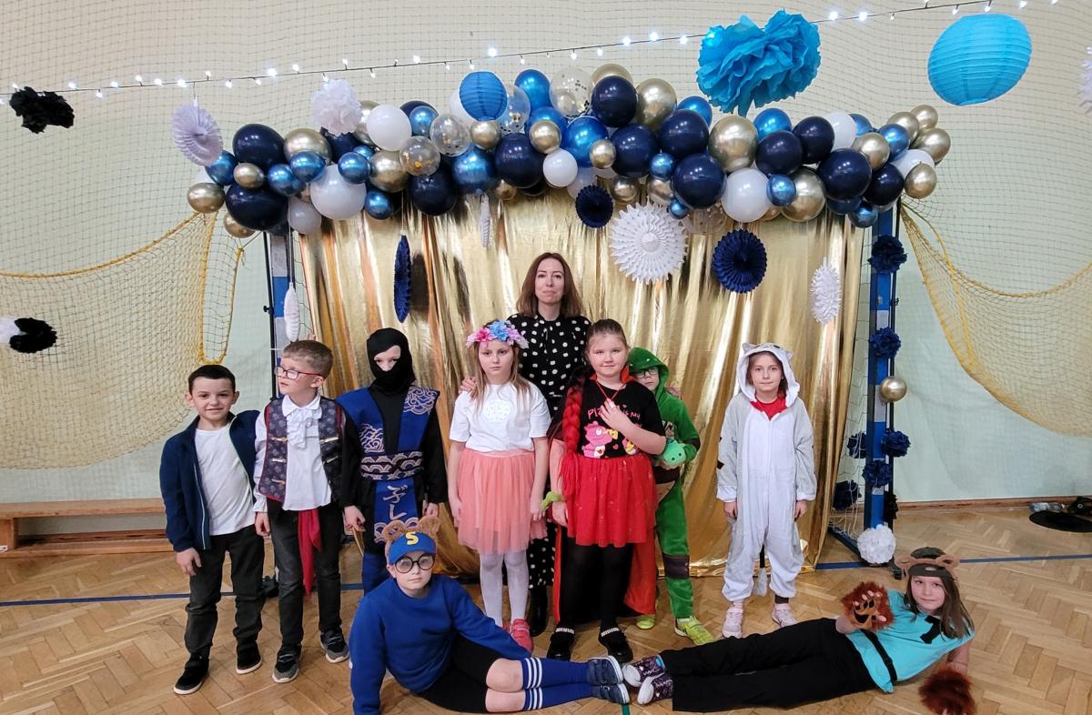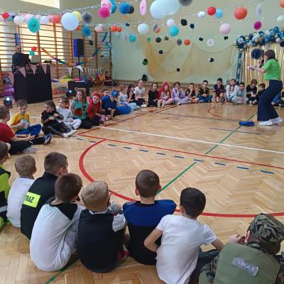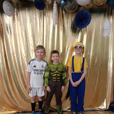 W naszej szkole odbył się bal karnawałowy dla uczniów klas I–III. Tego dnia sala wypełniła się muzyką, śmiechem i kolorami. O świetną oprawę muzyczną zadbał DJ, który puszczał ulubione hity dziecięce, zachęcając wszystkich do tańca.