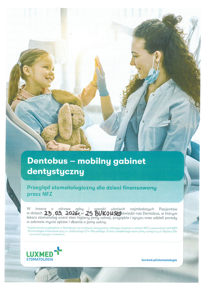 W dniu 23 marca 2026 r. naszą placówkę odwiedzi Dentobus – mobilny gabinet stomatologiczny, który oferuje dzieciom i młodzieży w wieku od 3 do 17 lat bezpłatne badania profilaktyczne oraz edukację z zakresu higieny jamy ustnej.