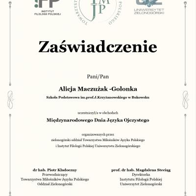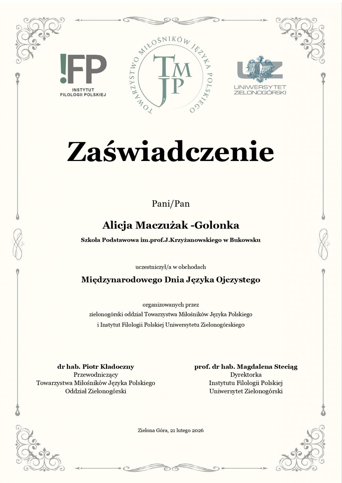 a przede wszystkim promować dbałość o polszczyznę i poprawne zachowania językowe. Młodzież włączyła się w ogólnopolski projekt: „Potyczki z polszczyzną 2026”, przygotowany we współpracy z Instytutem Filologii Polskiej Uniwersytetu Zielonogórskiego w formie gier Kahoot. Motywem przewodnim zadań okazała się reforma ortografii. Integralną częścią zajęć były nagrania wideo z udziałem prof. dr hab. Magdaleny Steciąg, członkinią Rady Języka Polskiego, dyrektorką Instytutu Filologii Polskiej oraz studentek filologii polskiej.