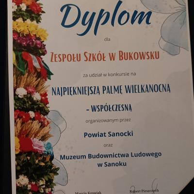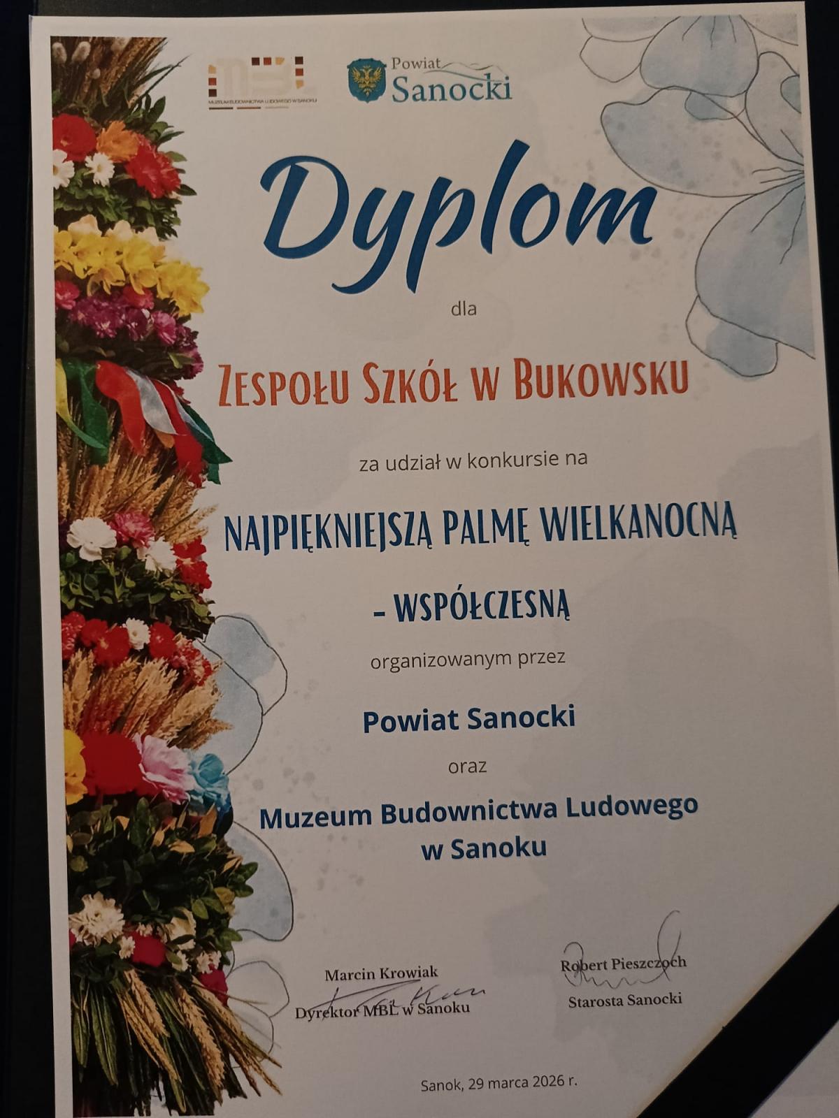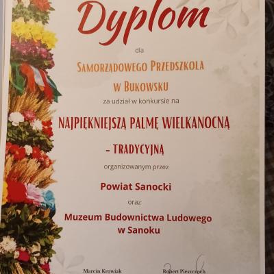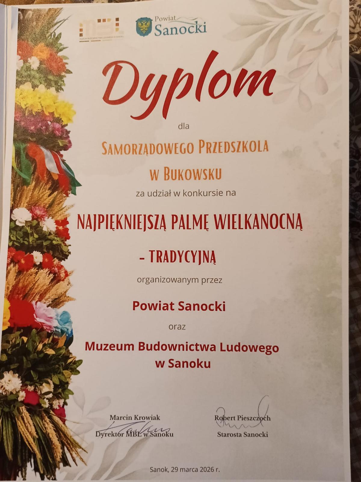 Natomiast to już czwarty raz, kiedy Samorządowe Przedszkole w Bukowsku uczestniczy w tej wyjątkowej uroczystości, jaką jest Niedziela Palmowa w sanockim skansenie. W tym roku przedszkole zaprezentowało ponownie palmę w kategorii tradycyjnej, wykonaną wyłącznie z naturalnych suszonych traw, kwiatów i bukszpanu.