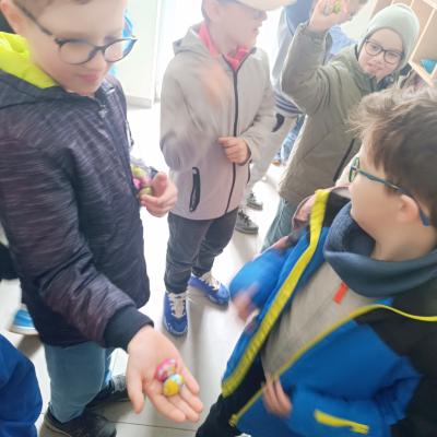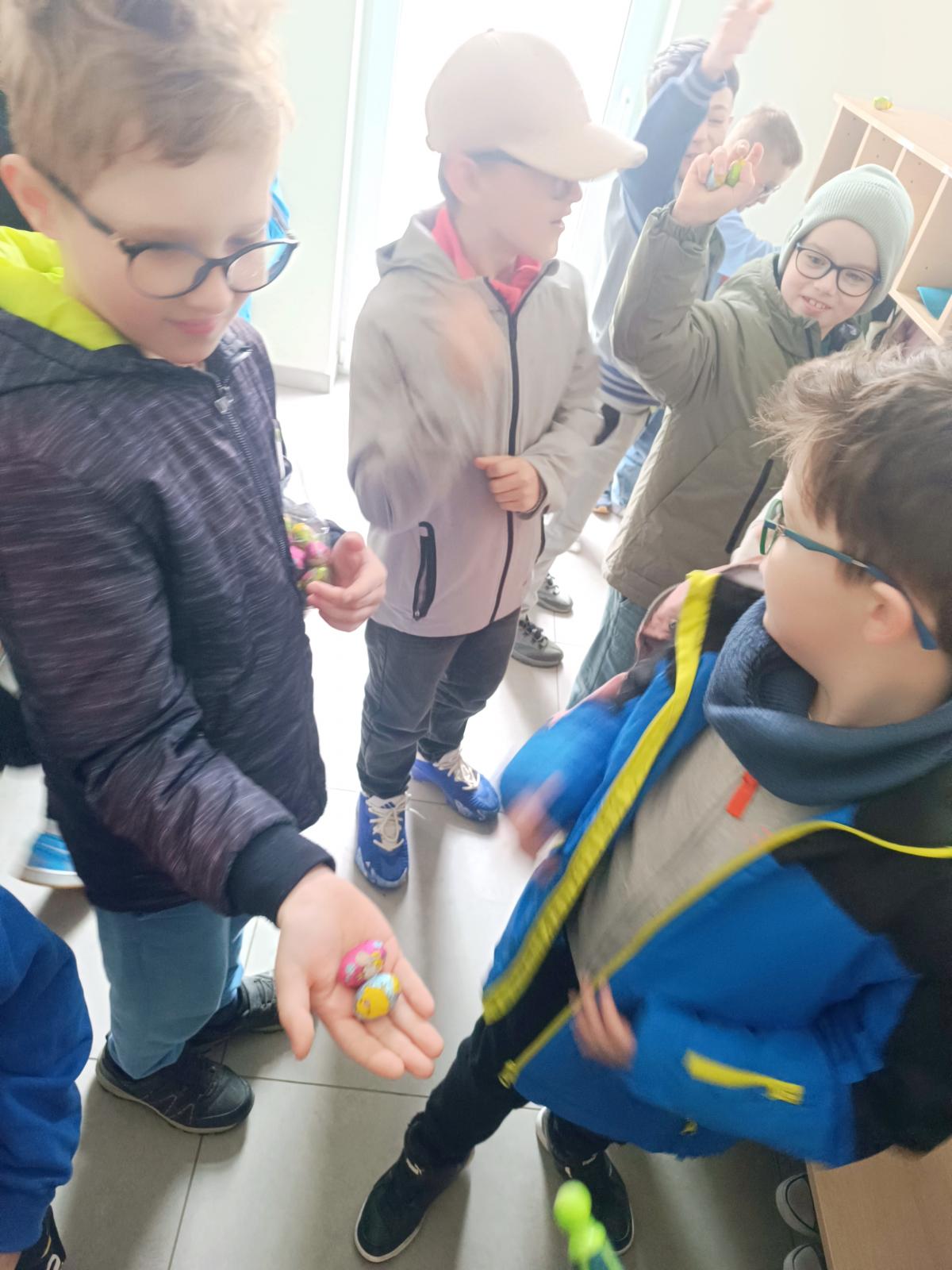 Jak się później okazało kolorowe jajka schowały się nie tylko w bibliotece ale także w różnych zakamarkach naszej szkoły np. w szatni, w klasie.